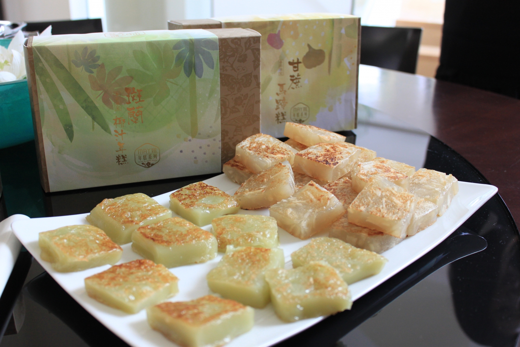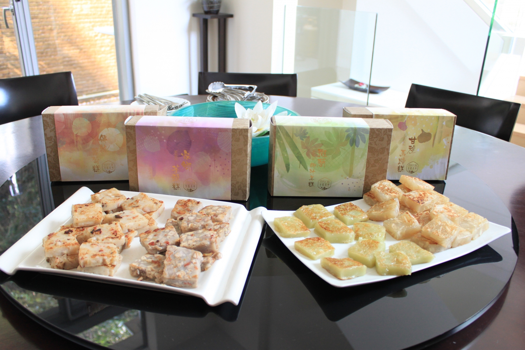 MAY姐的糕點有: 蘿蔔糕, 芋頭糕, 斑蘭椰汁年糕及馬蹄糕