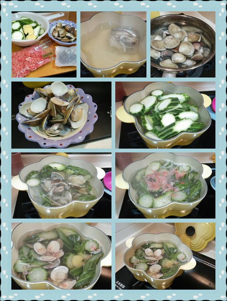 櫻花蝦勝瓜蜆仔滾湯 材料:勝瓜 1條 蜆 半斤櫻花蝦 適量韓國昆布魚仔湯包 一包 (1) 先將韓國昆布魚仔湯包放在適量水中, 滾它20分鐘, 做一鍋湯底.(2 另一鍋, 先把蜆出一出水, 以防有沙. 然後瀝乾水份, 備用.(3) 步驟(1)的湯底滾好後, 加入巳切好的勝瓜滾一會,(4) 隨即再加入蜆, 滾約十分鐘, 最後加入櫻花蝦, 完成. **中間自行試味, 若不夠味請自行加入適量的鹽. 但我就沒有加, 因為我... 看全文 -