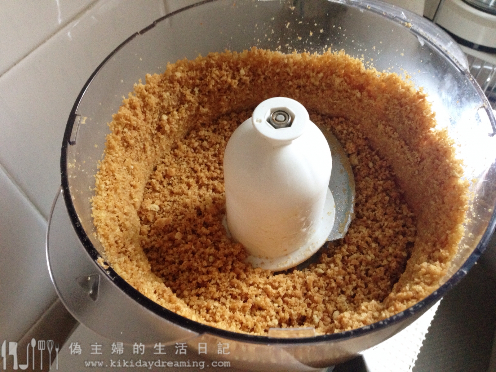 2) 然後做派底,把牛油煮融,再和消化餅一起用攪拌機打碎