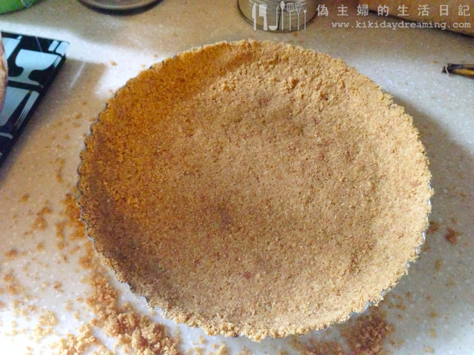 3) 派盤掃一點牛油,然後把消化餅碎鋪上,壓平