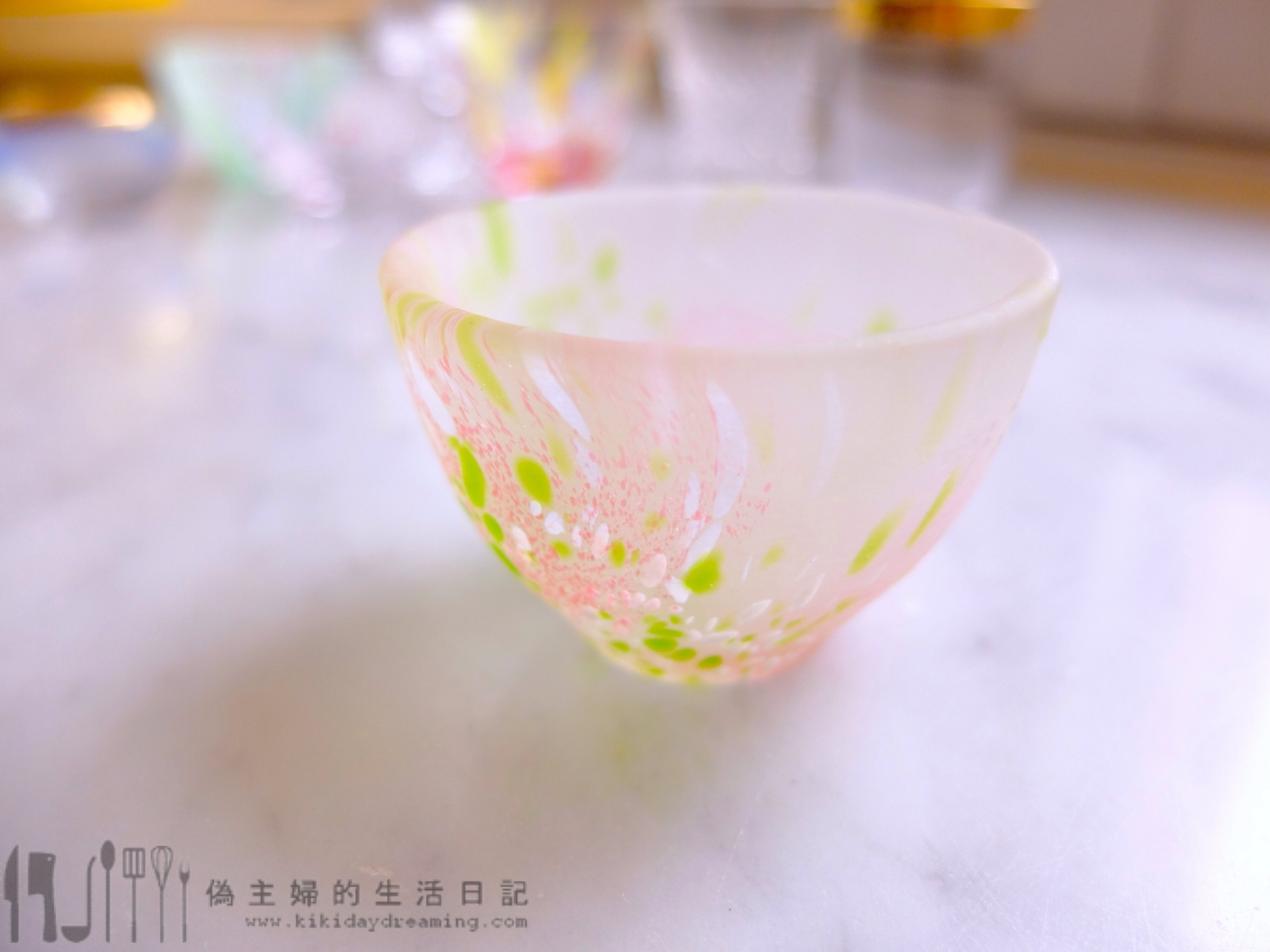 很喜歡這一隻磨砂、而且有水彩圖案的清酒杯,好清新