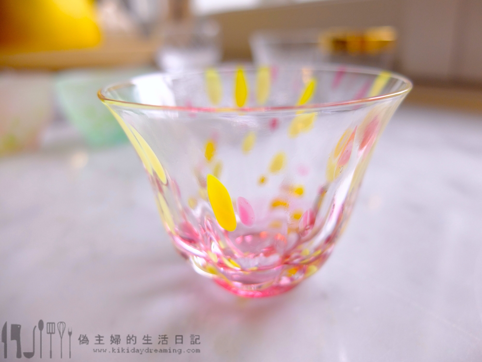 粉紅色的玻璃上點了鮮黃的水彩圖案,非常搶眼