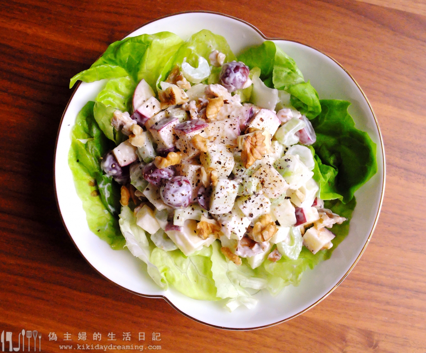 最先的華道夫沙律,就只有蘋果、西芹和合桃,拌以蛋黃醬(Mayonnaise),再用生菜墊底上菜。後來演變到加入新鮮或乾提子,也會加入雞肉等肉類,有些食譜也用Yogurt代替蛋黃醬,令原本好簡單的沙律也豐富起來呢。