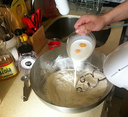 (6) 將雞蛋逐個逐個慢慢加入(*師傅Tips:如果一次過入加的話會很難攪拌,又增加了攪拌的時間,麵團就很易起筋)