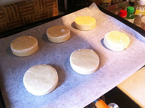 (19)放到烤盤上準備,烤箱同時預熱200C,麵團可以放十多分鐘醒一醒麵(我家沒有小一點的模子,所以Scone印出來很大塊,哈哈)