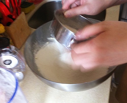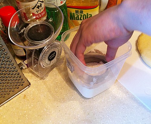 (3) 麵粉和Baking Powder篩進,再加入糖