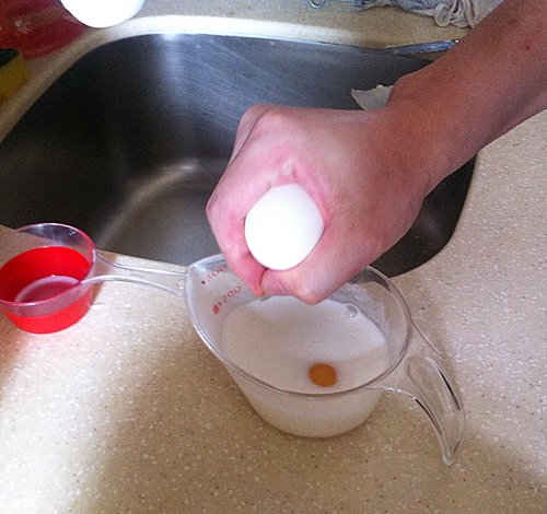 (5) 將雞蛋打到牛奶裡(單手打雞蛋,帥氣呀)