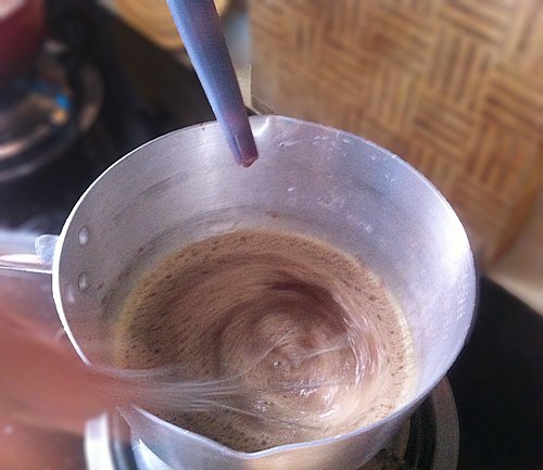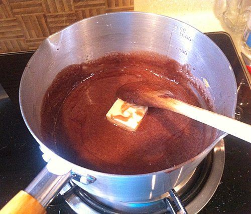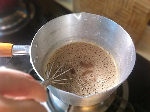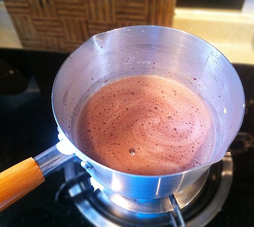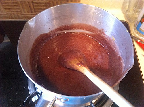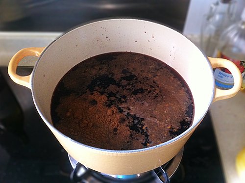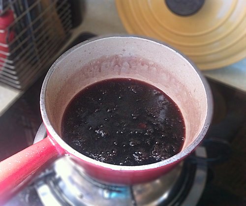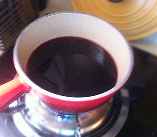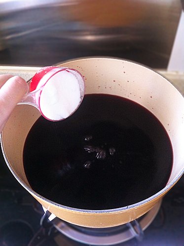 (2) 紅酒和水加進鍋裡,再加入糖拌勻