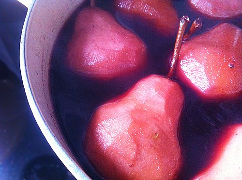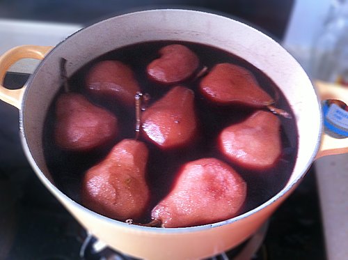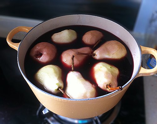(6) 紅酒只是僅僅蓋過梨就可以,不夠的話再加紅酒、水和糖(1杯紅酒+水:1/3杯的糖)