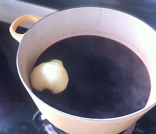 (5) 放到煮好的紅酒裡,再處理下一個梨