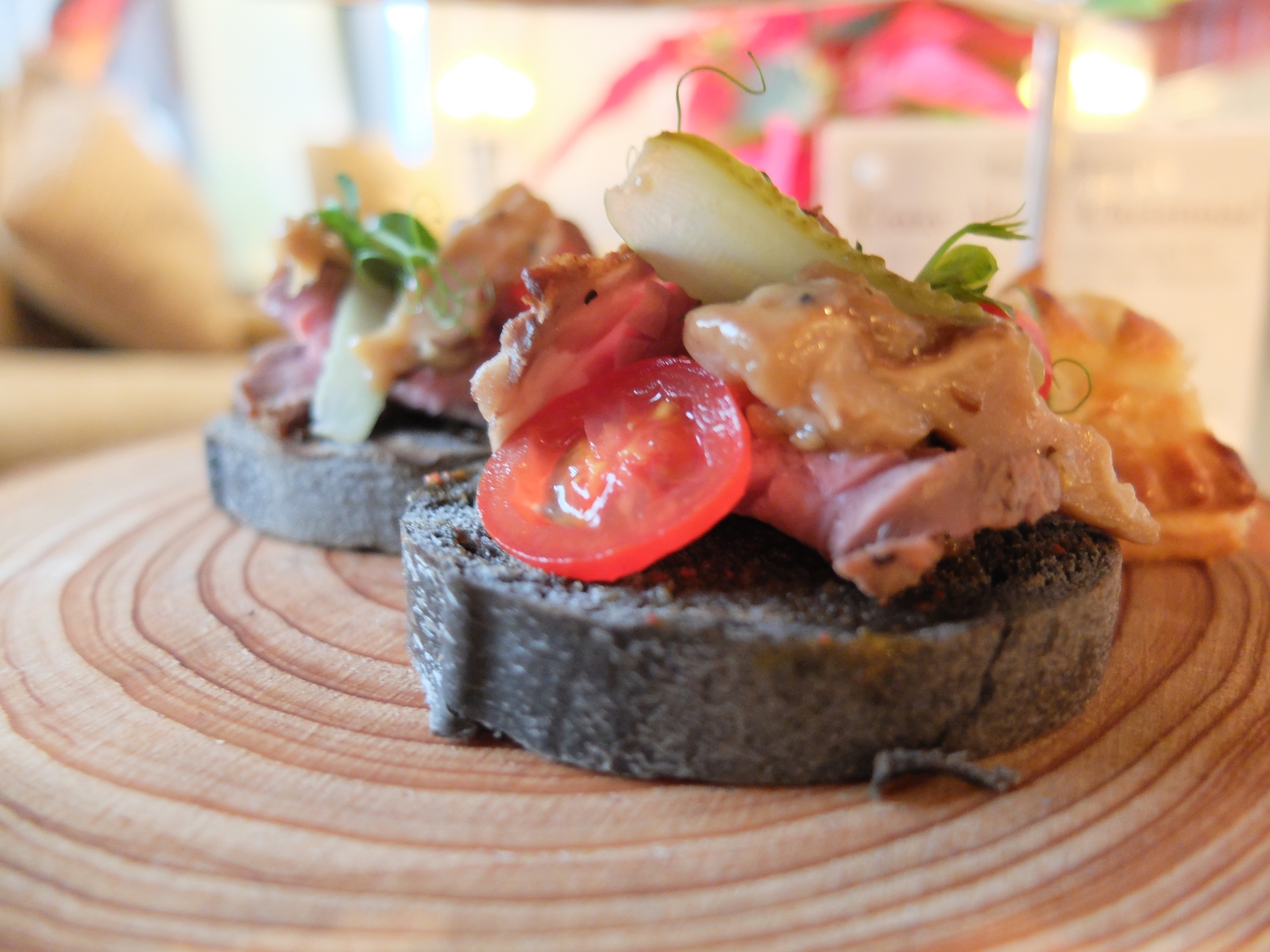 來逐一介紹下午茶架上的精緻小點心吧!先鹹點三文治部份的炭燒墨魚汁麵包,抹上辣椒牛油醬,上面鋪著烤和牛及牛肝菌 微辣的牛油醬添了一點點辣勁,中和了和牛的油膩,墨魚汁麵包也好好吃很特別