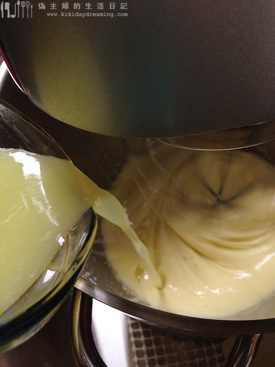 12. 然後慢慢加入煉奶,再拌3-4分鐘直至整盤質感變厚身