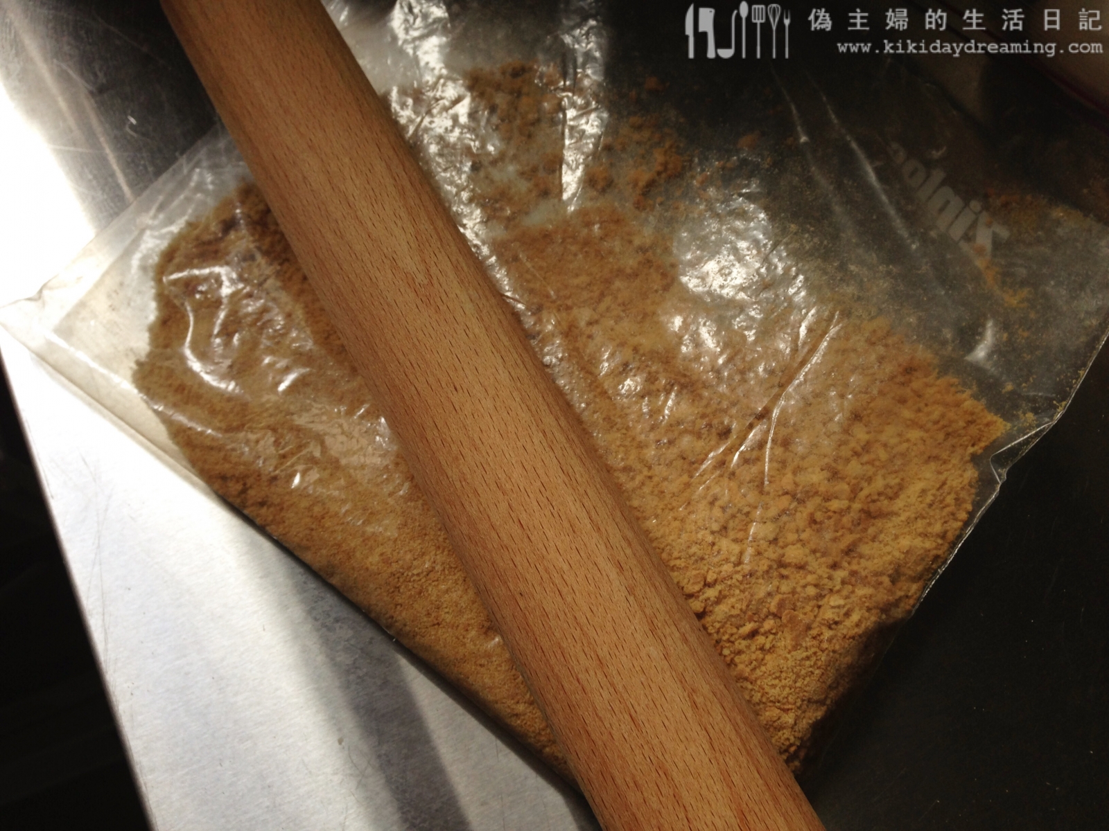 2. 把餅乾壓碎,不用攪拌機也可以把餅乾裝到密實袋中,用麵棍去壓