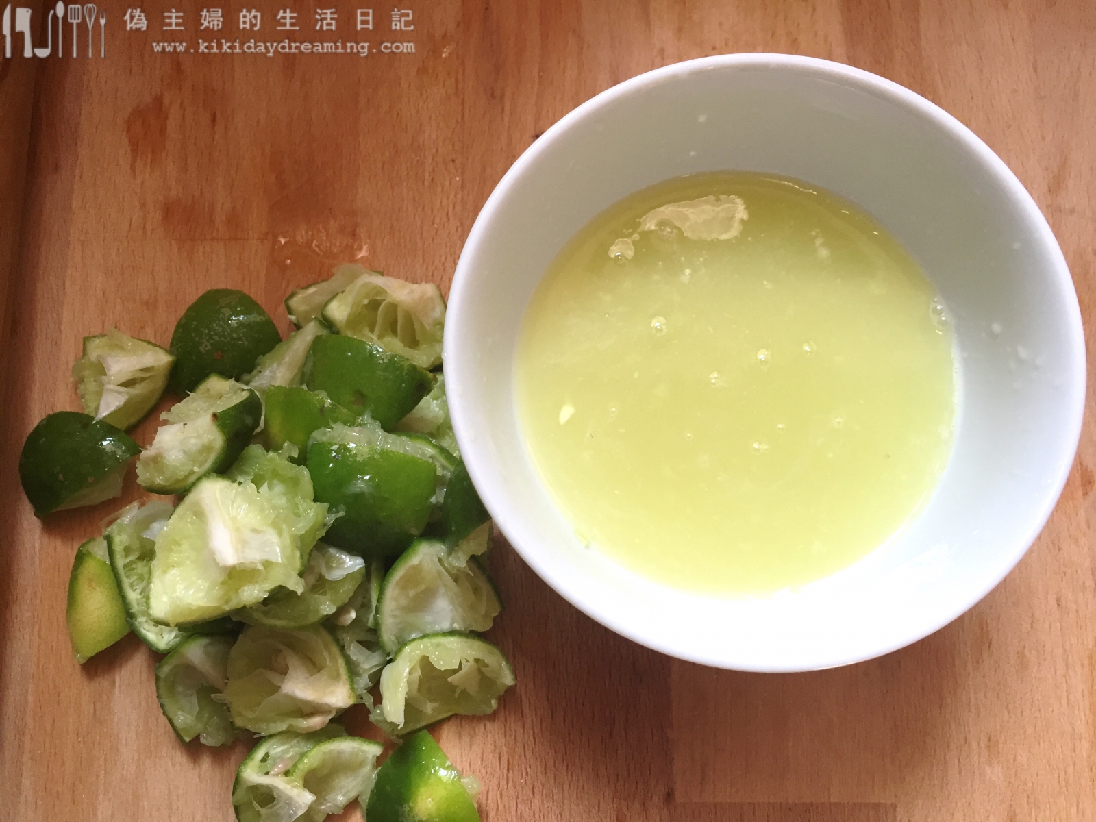 8. 到派餡了,先準備青檸汁,小小的青檸不易榨汁,大家可以試試用壓蒜器來榨,輕鬆很多呢(在此重溫)