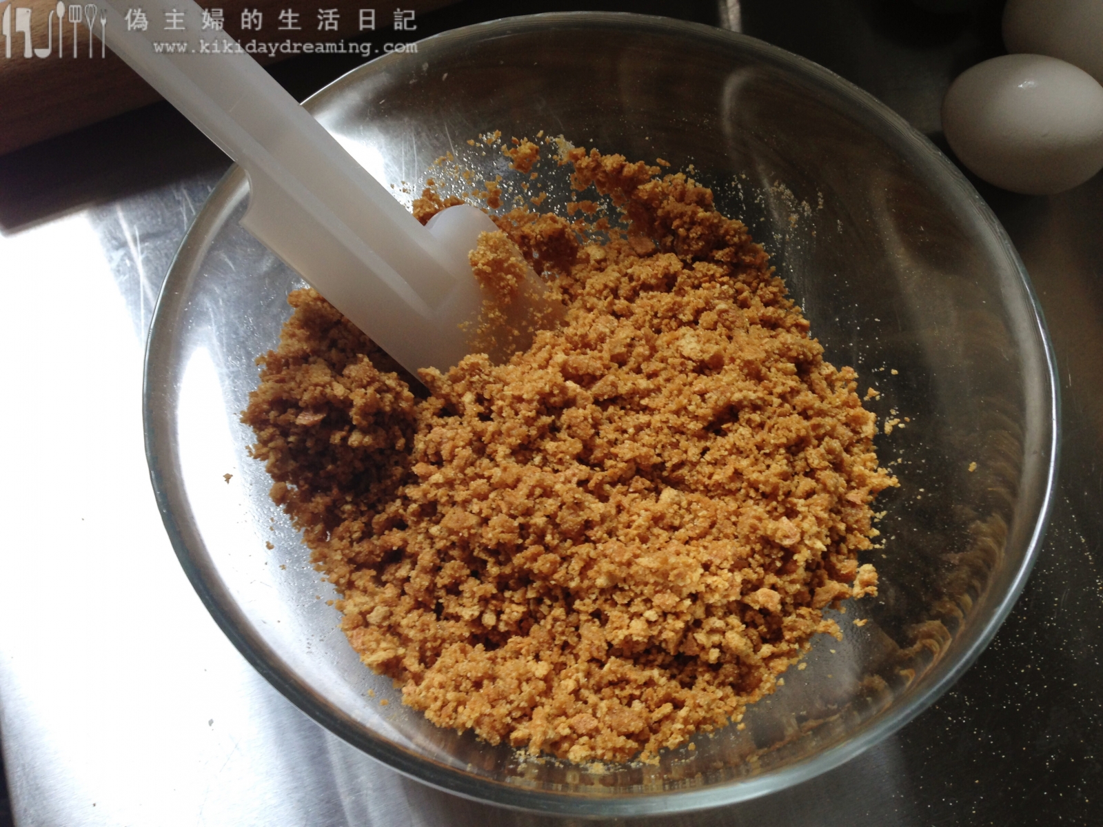 4. 將糖、餅乾碎和溶好的牛油充份拌勻