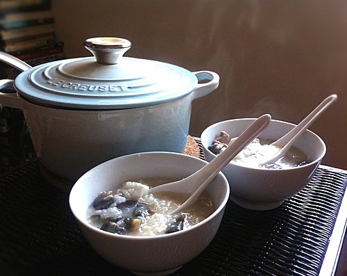 Le Creuset Family Sale的毒害太深,繼續要吃清茶淡飯,而且還要是剩菜,好可憐好窮呀我(誤!)。粥品之中我最喜歡吃的就是皮蛋瘦肉粥,每次飲茶都必點,不過親友的男友堅持要加咸蛋進粥內,所以就變成了這鍋金銀蛋瘦肉粥了。今次處女登場的鍋是Powder Blue 18cm French Oven: