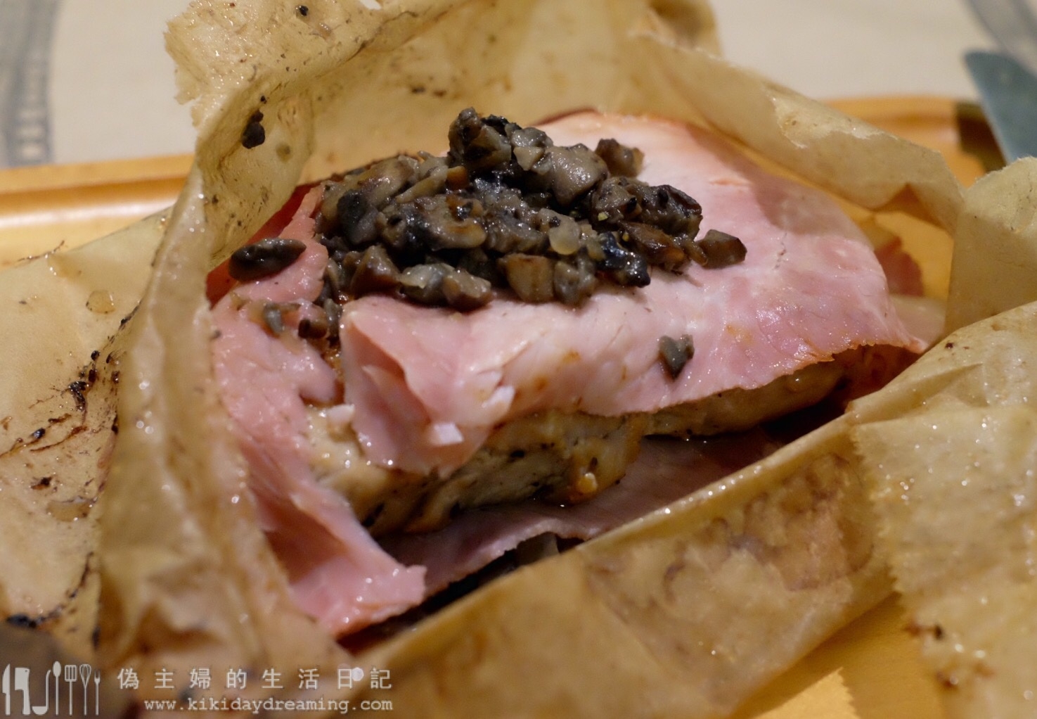 沒錯了,就是很簡單把小牛扒、火腿和嫩煎蘑菇這些"驚喜",用紙包著進烤箱烤至金黃,然後把紙包打開來:Ta-Da!!,就是好驚喜的驚喜小牛扒了。