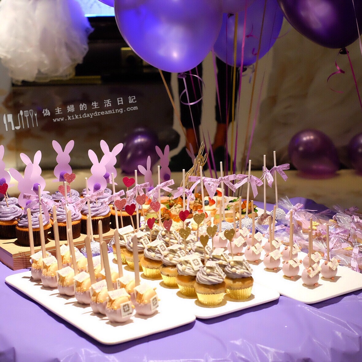 不過這一天正事要緊,我們要趕在準新娘來到前把房間佈置準備好,這一次的派對主題是紫色Playboy Bunny,所以特別從sift訂了紫色的杯子蛋糕,還買了很可愛的紫色兔子裝飾