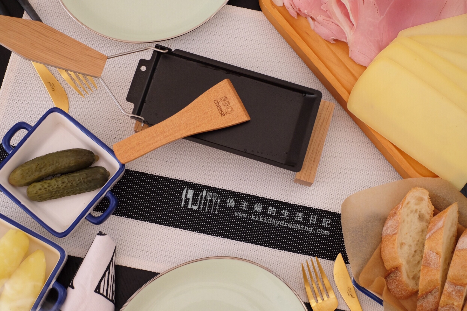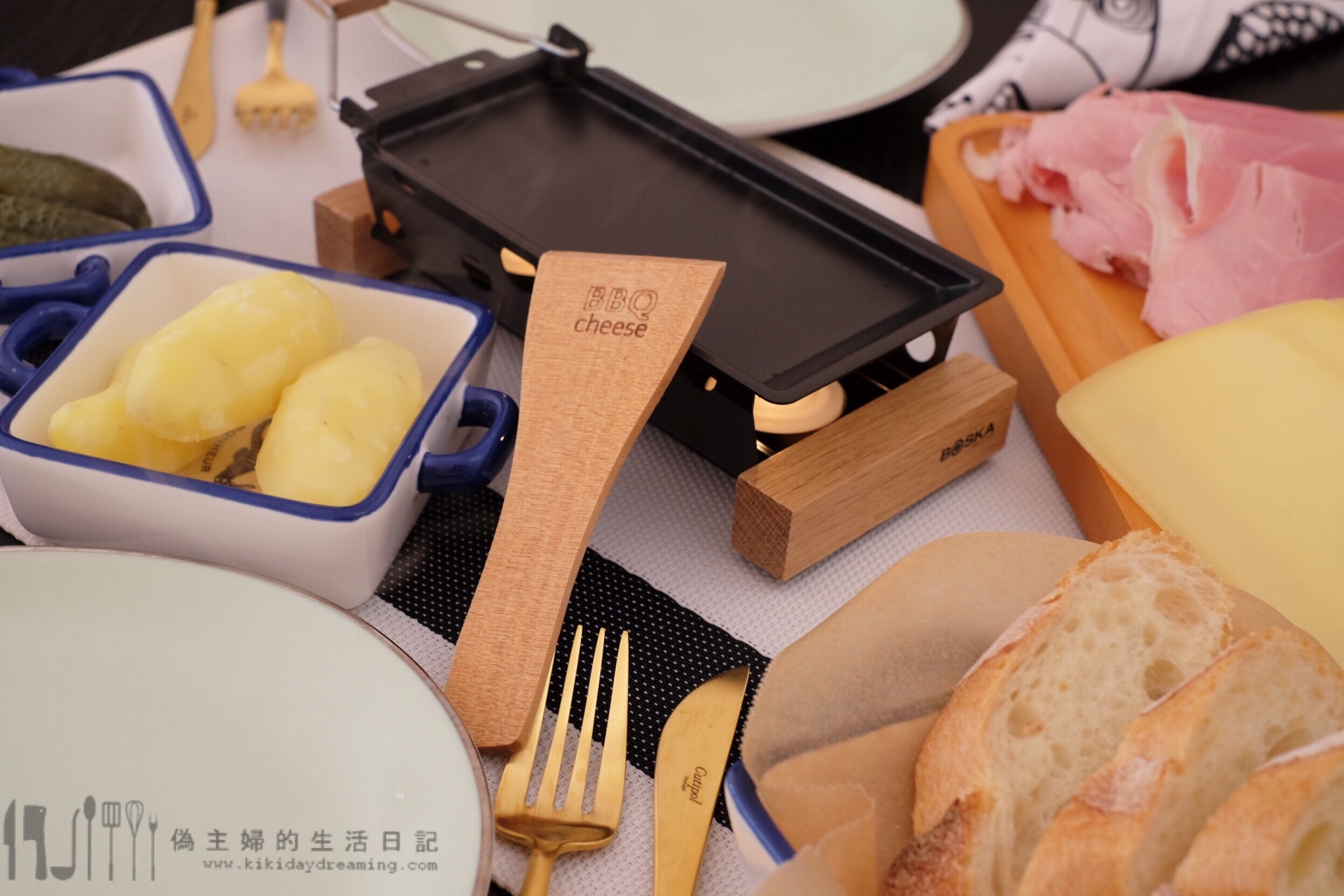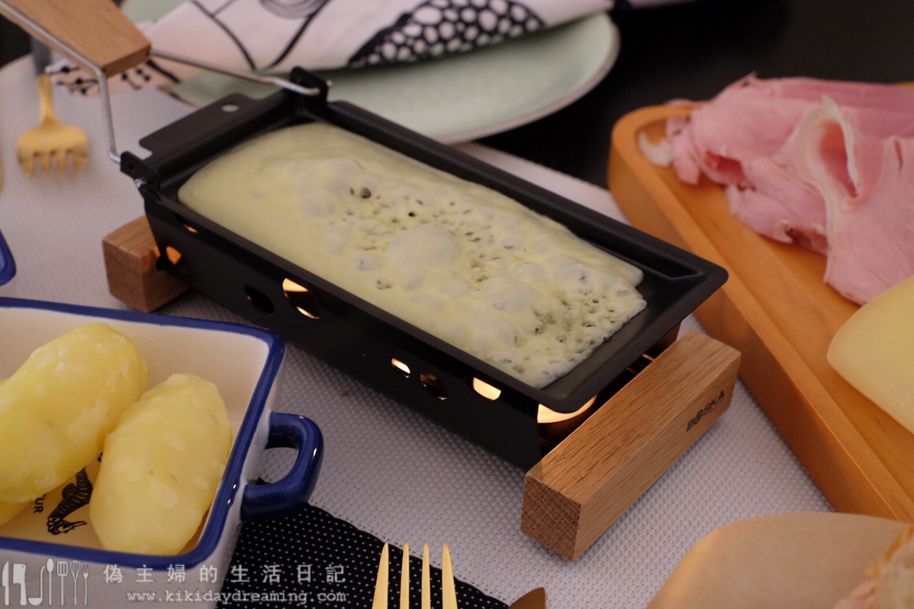 除了Raclette芝士外,還好認真的準備了火腿、長棍麵包、醃酸瓜和馬鈴薯,之前去滑雪村的餐廳都是這樣配的