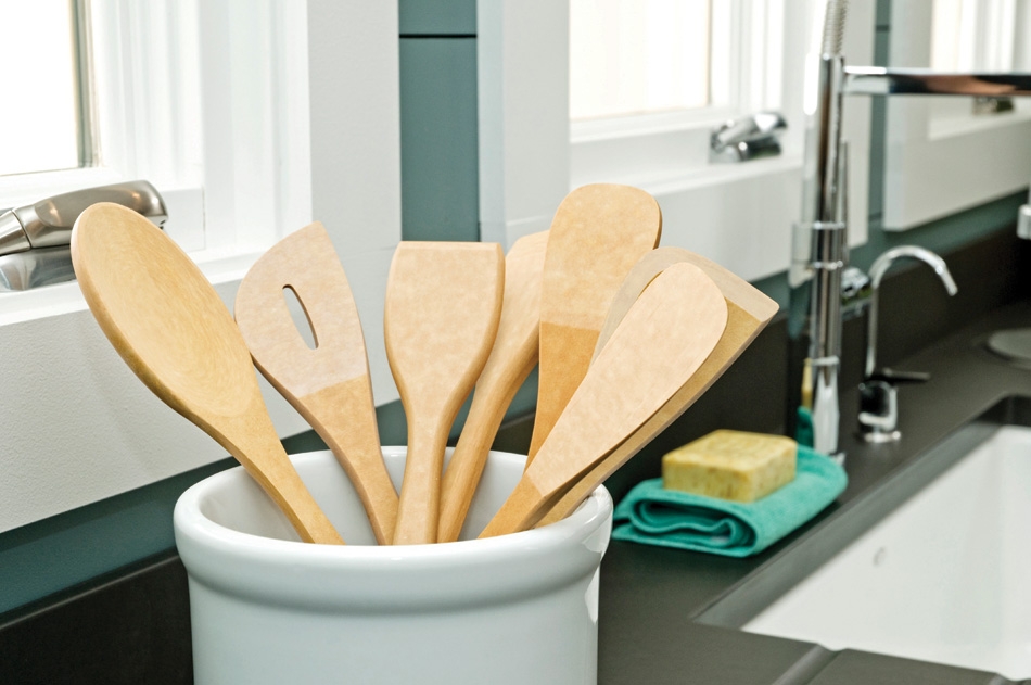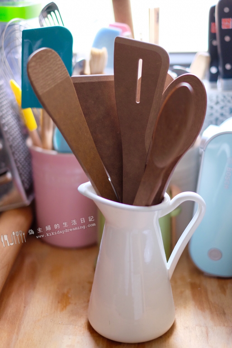 雖然我的廚房裡有林林總總不同的玩具,可是要數用得最多的,當然是鏟勺這類入廚工具。除了小部份是不鏽鋼製的外,我家大部份的鏟勺都是木的,這樣在任何鍋子上使用都不怕刮花,尤其是LC鍋這麼嬌嫩的法瑯層,不能用不鏽鋼製的煮食用來刮呀(雖然我家的所有鍋子依然都是花斑斑的就是)。