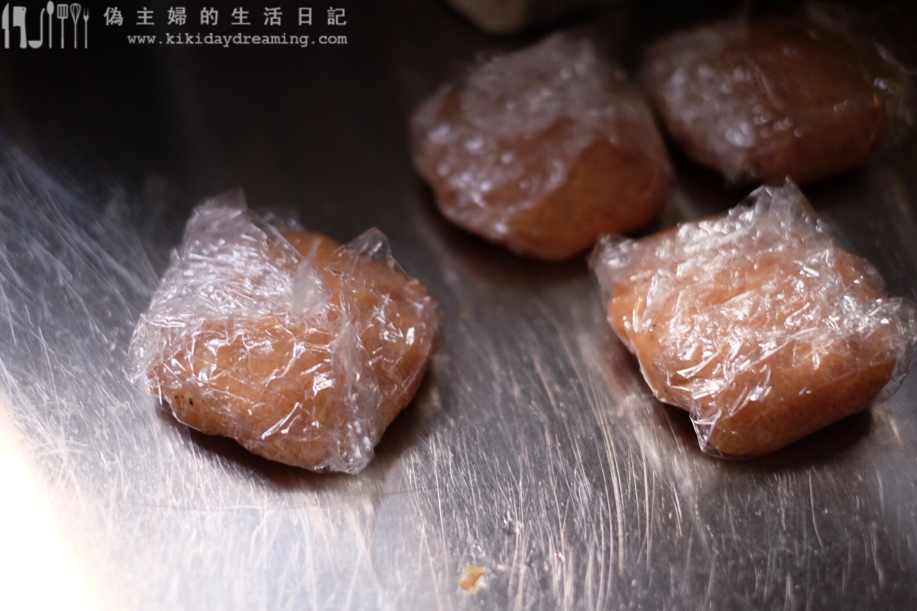 5. 分成四等份,手塗點油然後左手拋右手、右手拋左手來回把肉裡的空氣拍走(詳細做法可以參考這一篇)
