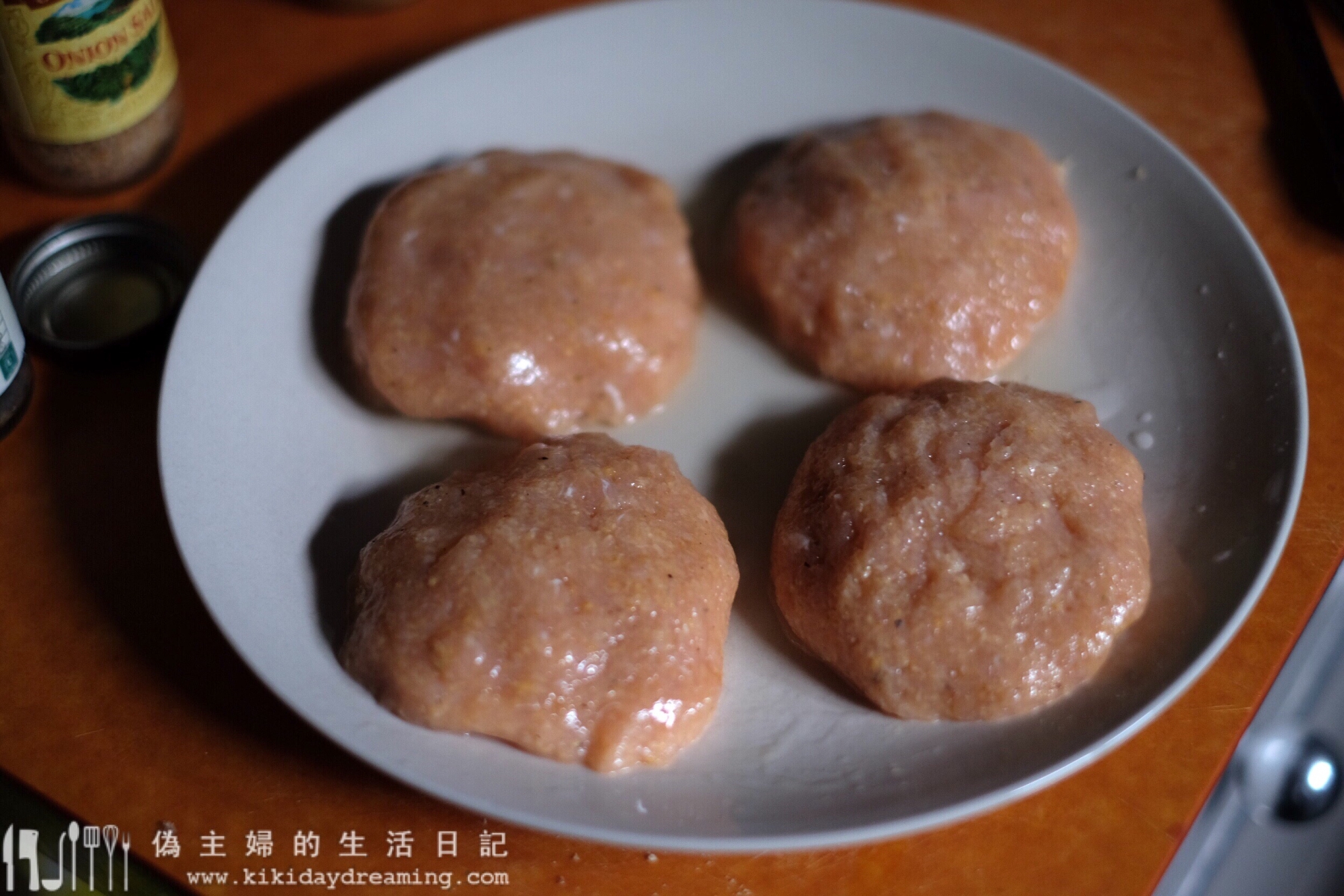 9. 鍋子下油燒熱,把雞肉漢堡放進