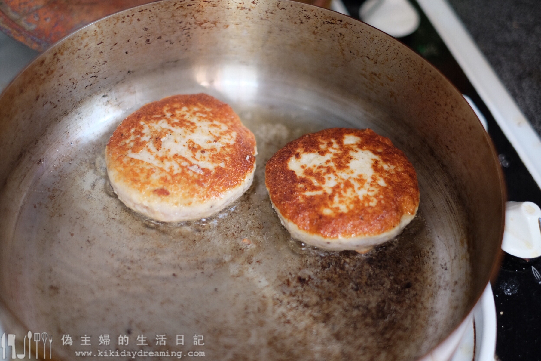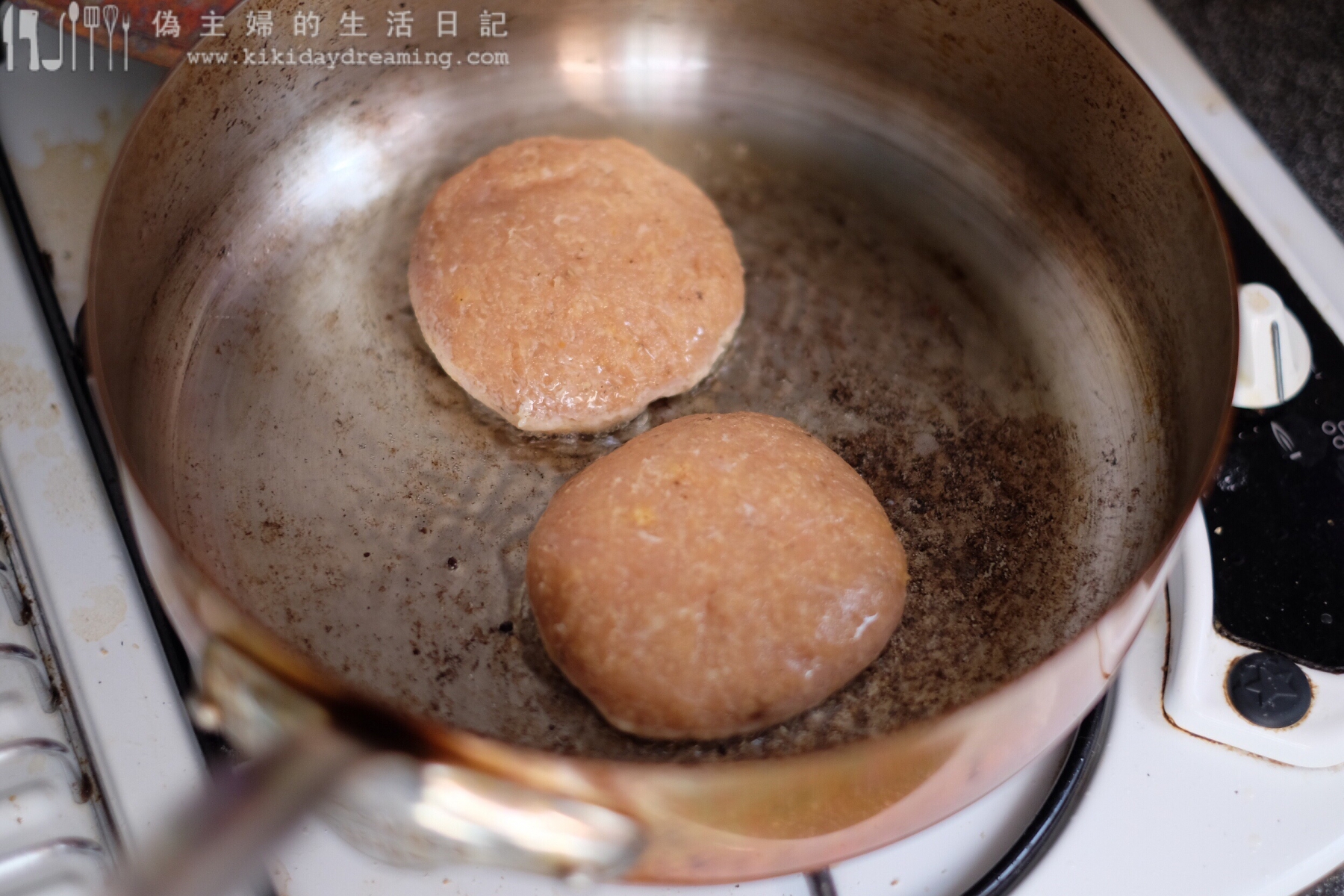 9. 鍋子下油燒熱,把雞肉漢堡放進