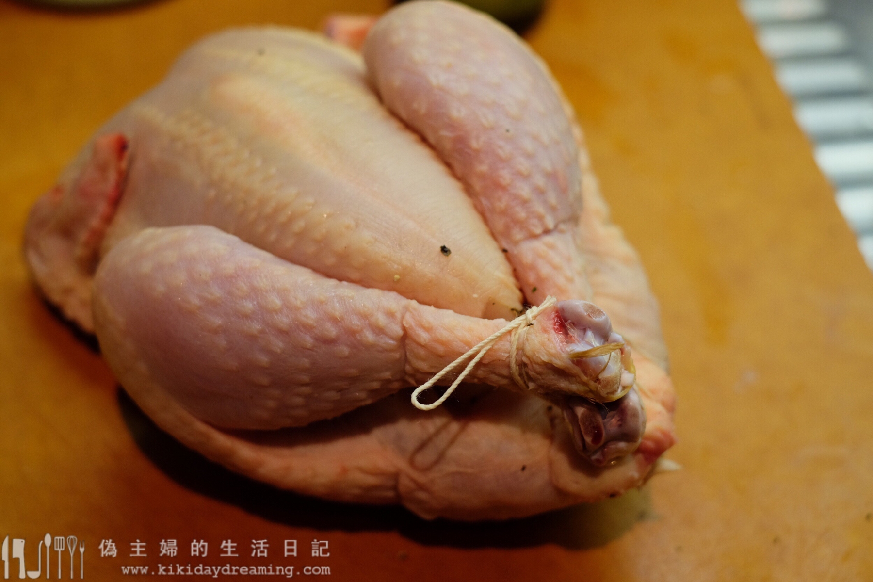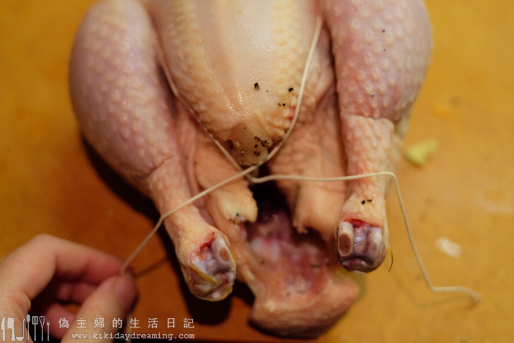 7. 綁的方法不詳述了(書BB裡有XD),重點是把雞腿這樣向上綁緊在一起就行