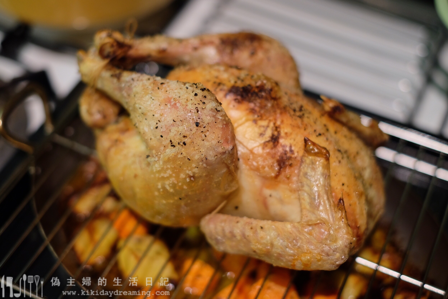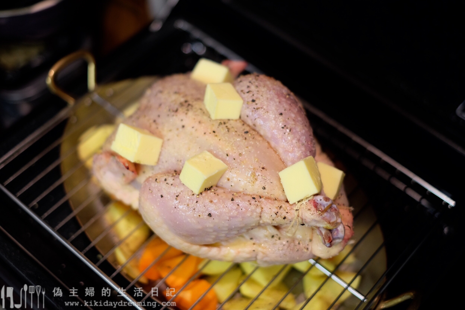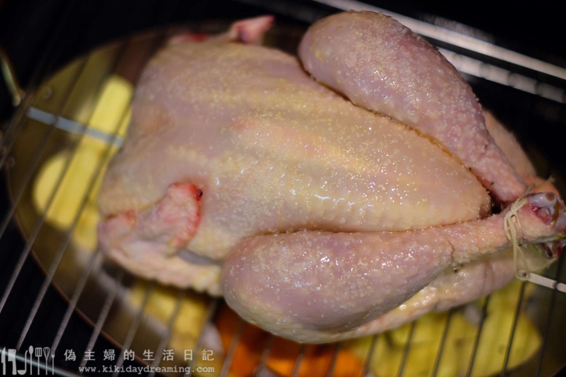9. 放到蔬菜上,我想全隻雞都烤得到,所以在蔬菜和雞之間放了個烤架隔開