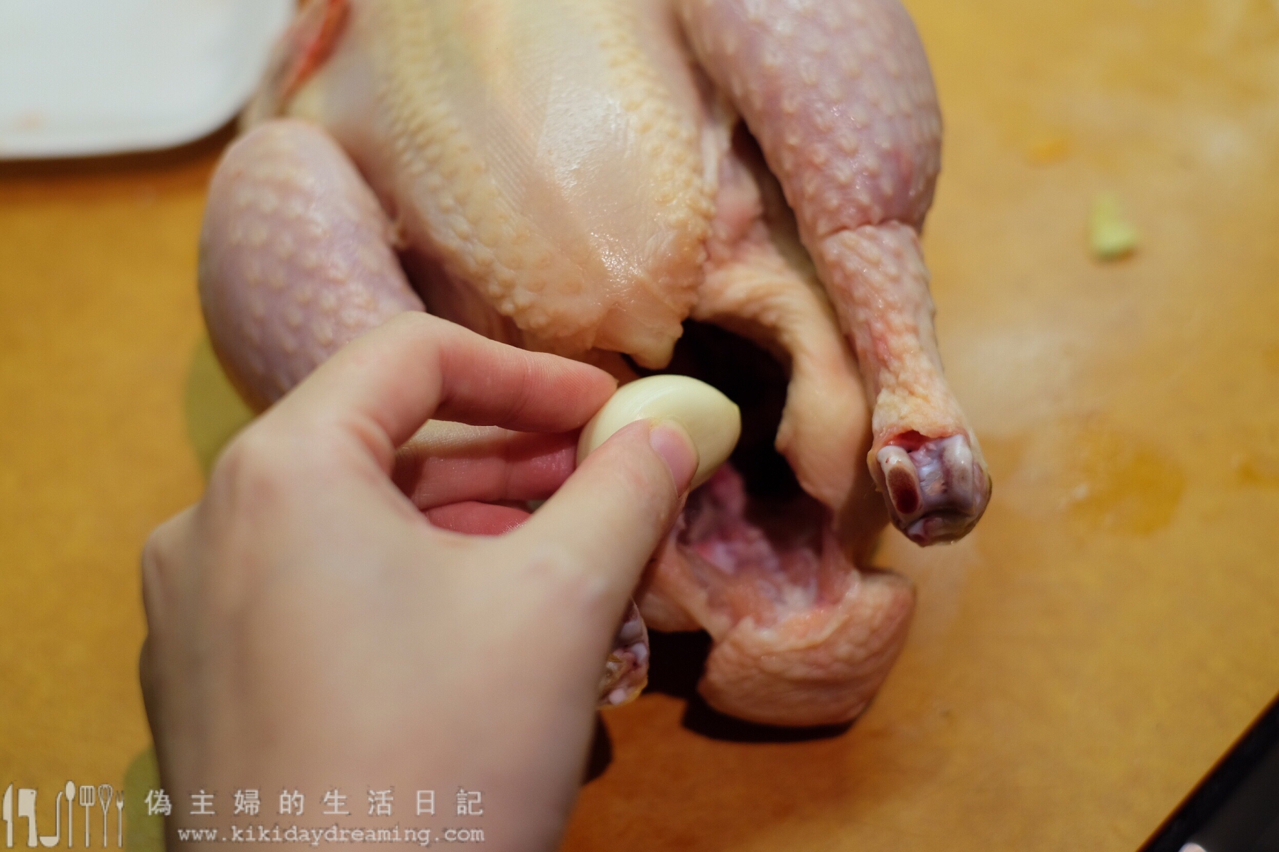 3. 雞洗淨抹乾,先把蒜粒抹到雞腔內