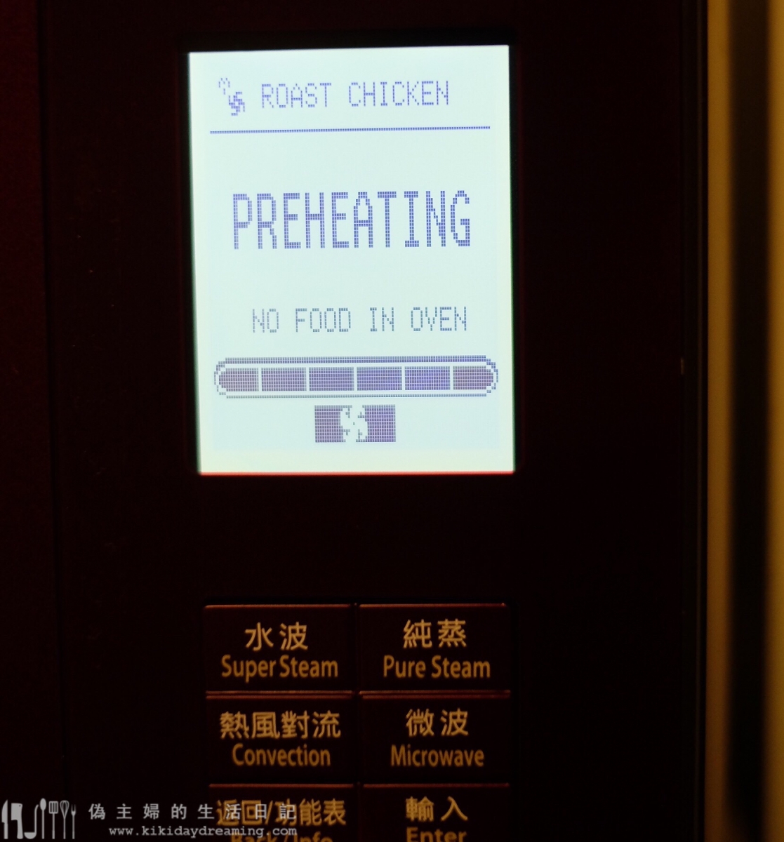 不過我的已是很舊的型號,市面上比它更新的型號有更多新功能,例如我的那部是沒有熱風對流的烤箱功能,就只有頂部發熱線沒有爐內風扇;蒸氣功能一定要配合微波使用沒有純蒸氣;超高溫水蒸氣的功能也不算很強,還有最重要的一點:我的那部是日本機,不單介面全是日文,而且電壓是100V,一定要用變壓器火牛才可以在香港220V的環境下使用。雖然一直相安無事,但還是有一點擔心的。