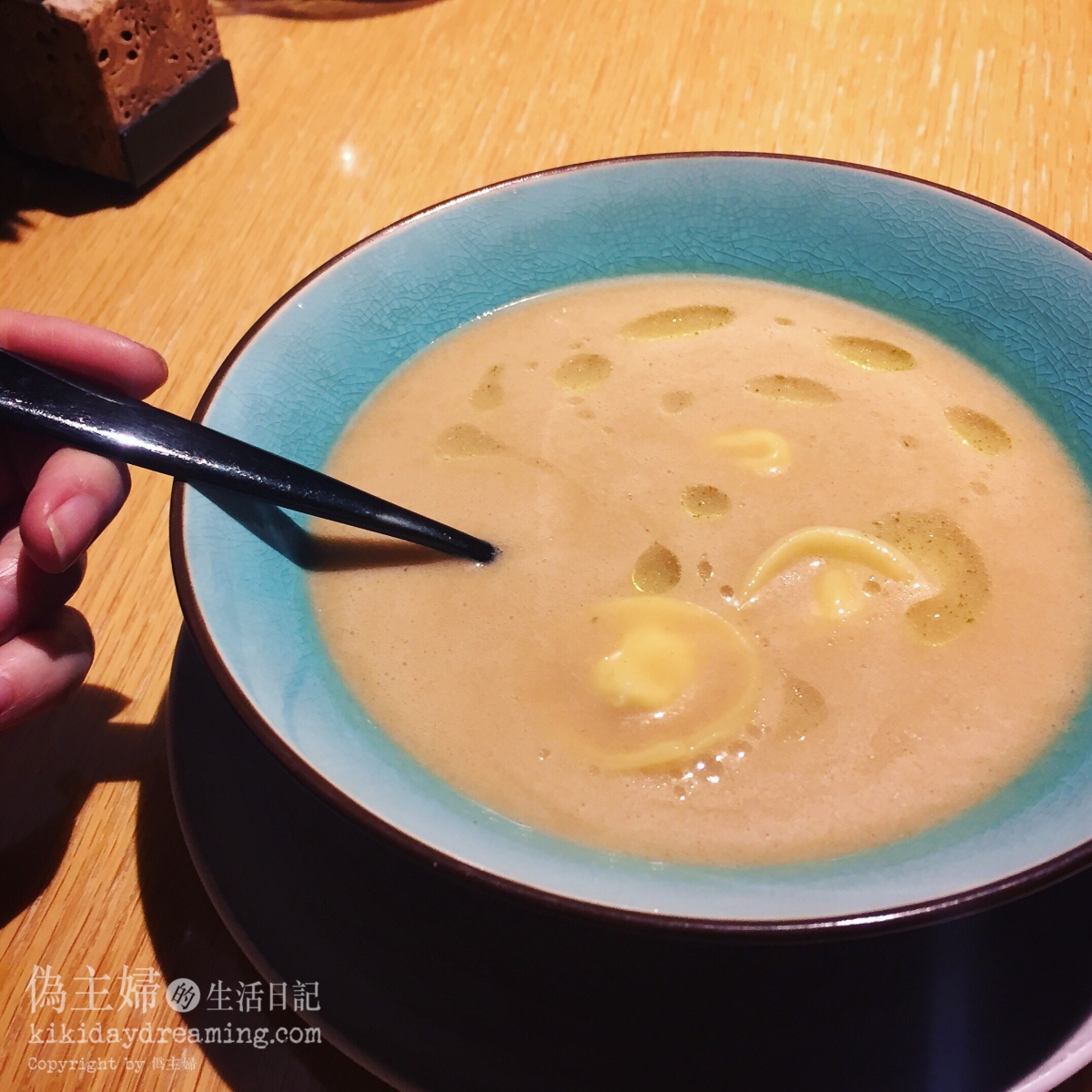 前菜一號是香橙醃大西洋三文魚配蟹肉,三文魚以有機的方式飼養,以橙汁醃過肉質跟煙三文魚差不多但有橙的清香,蟹肉也是用手釣的蟹