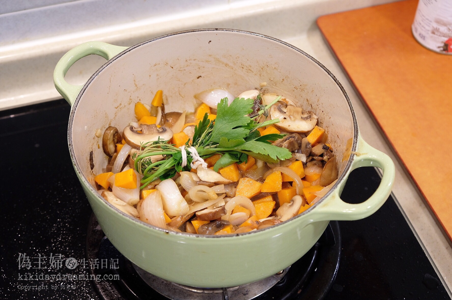9. Parsley和Thyme可以綑成香草包,加入一起炒一下
