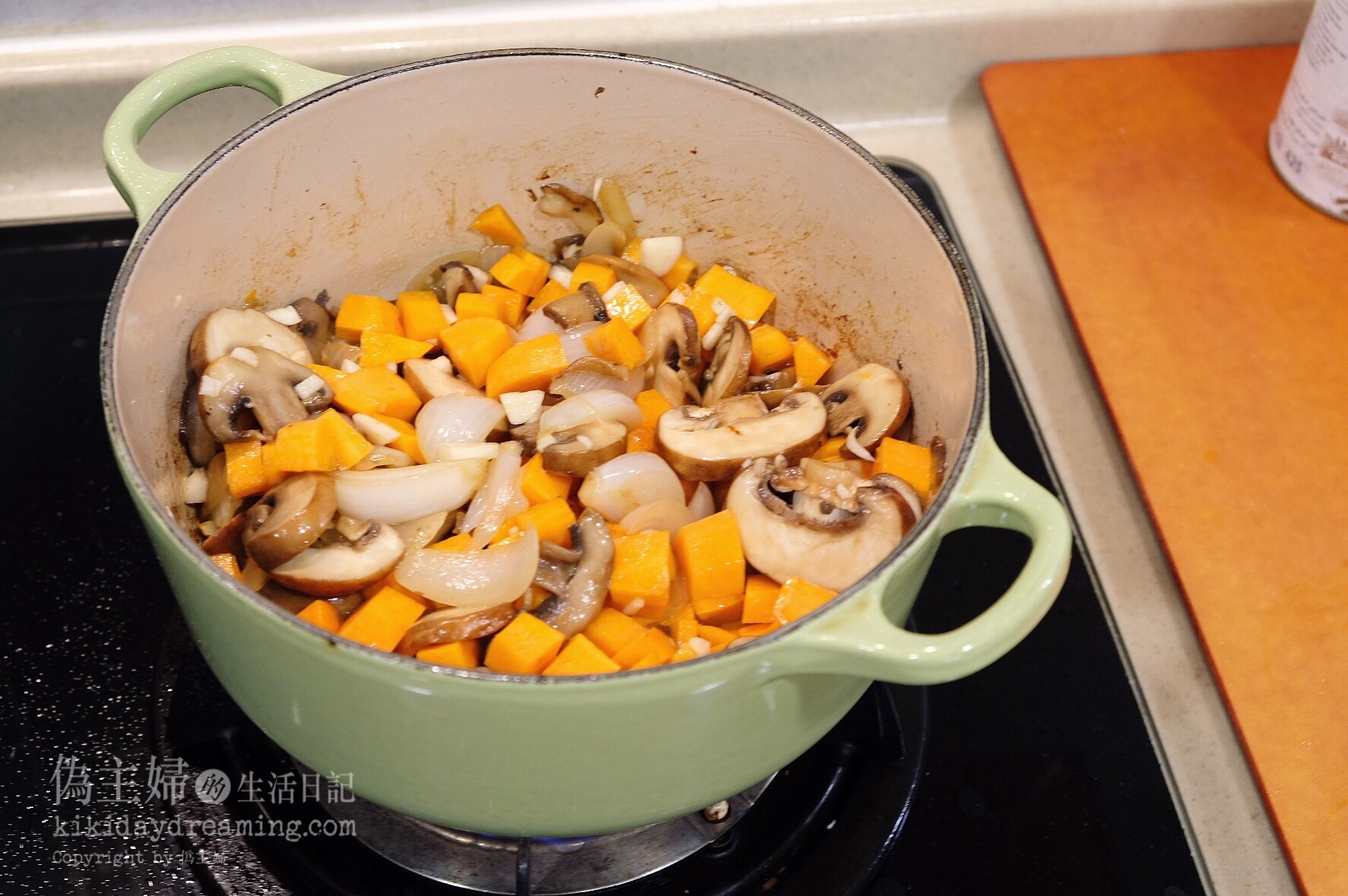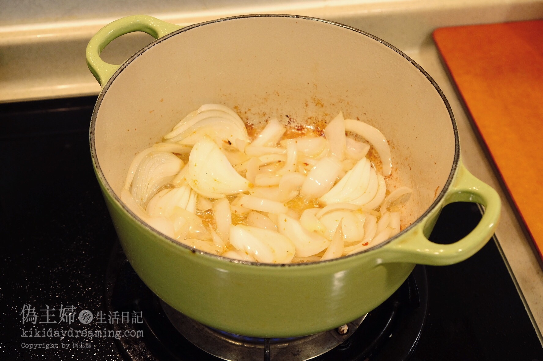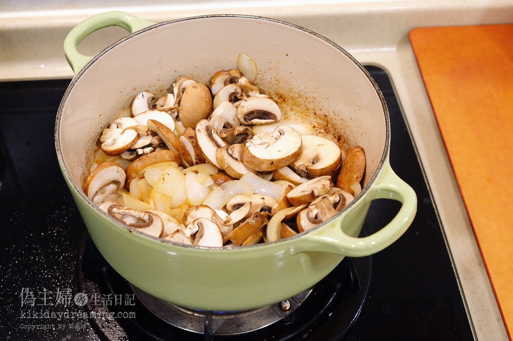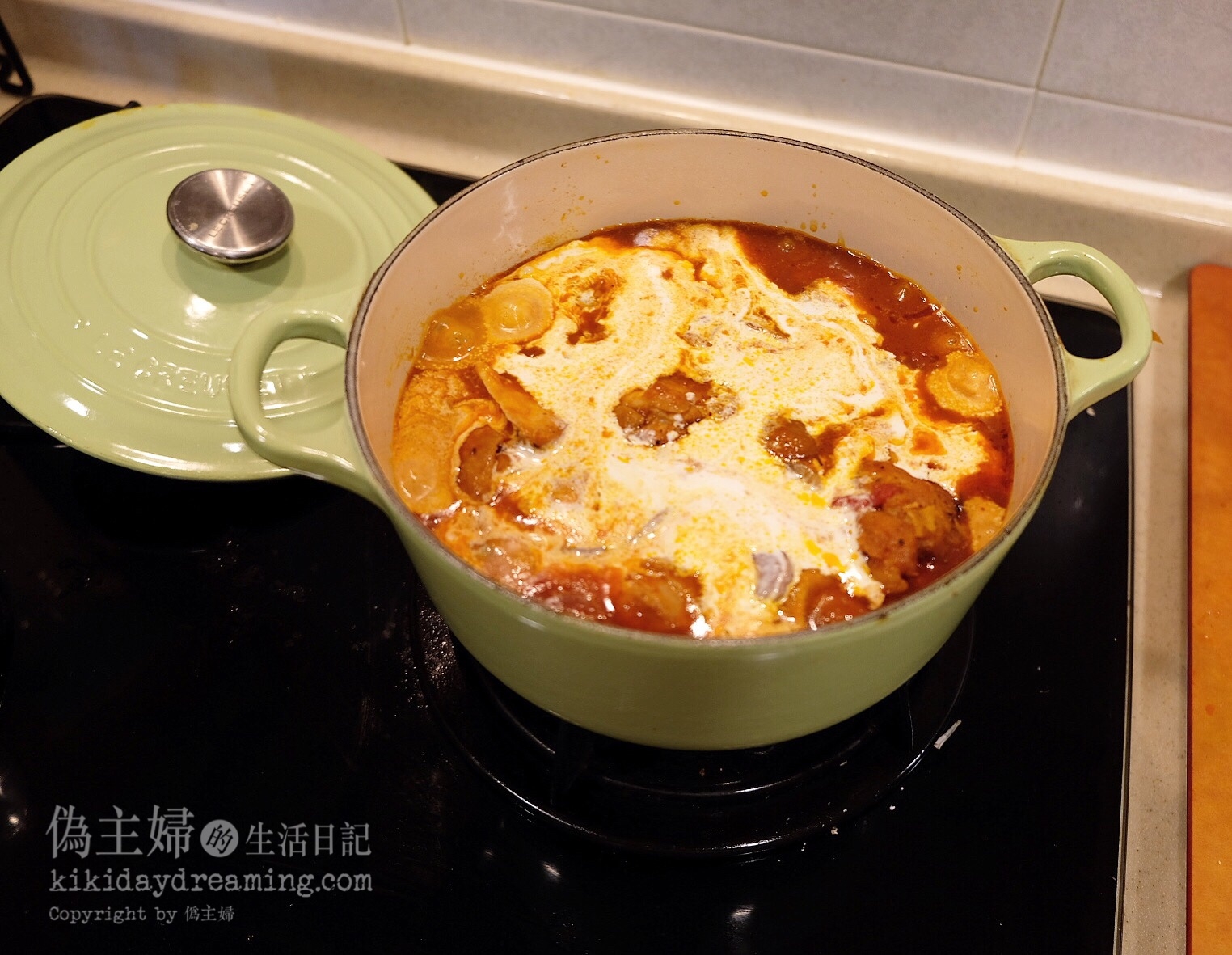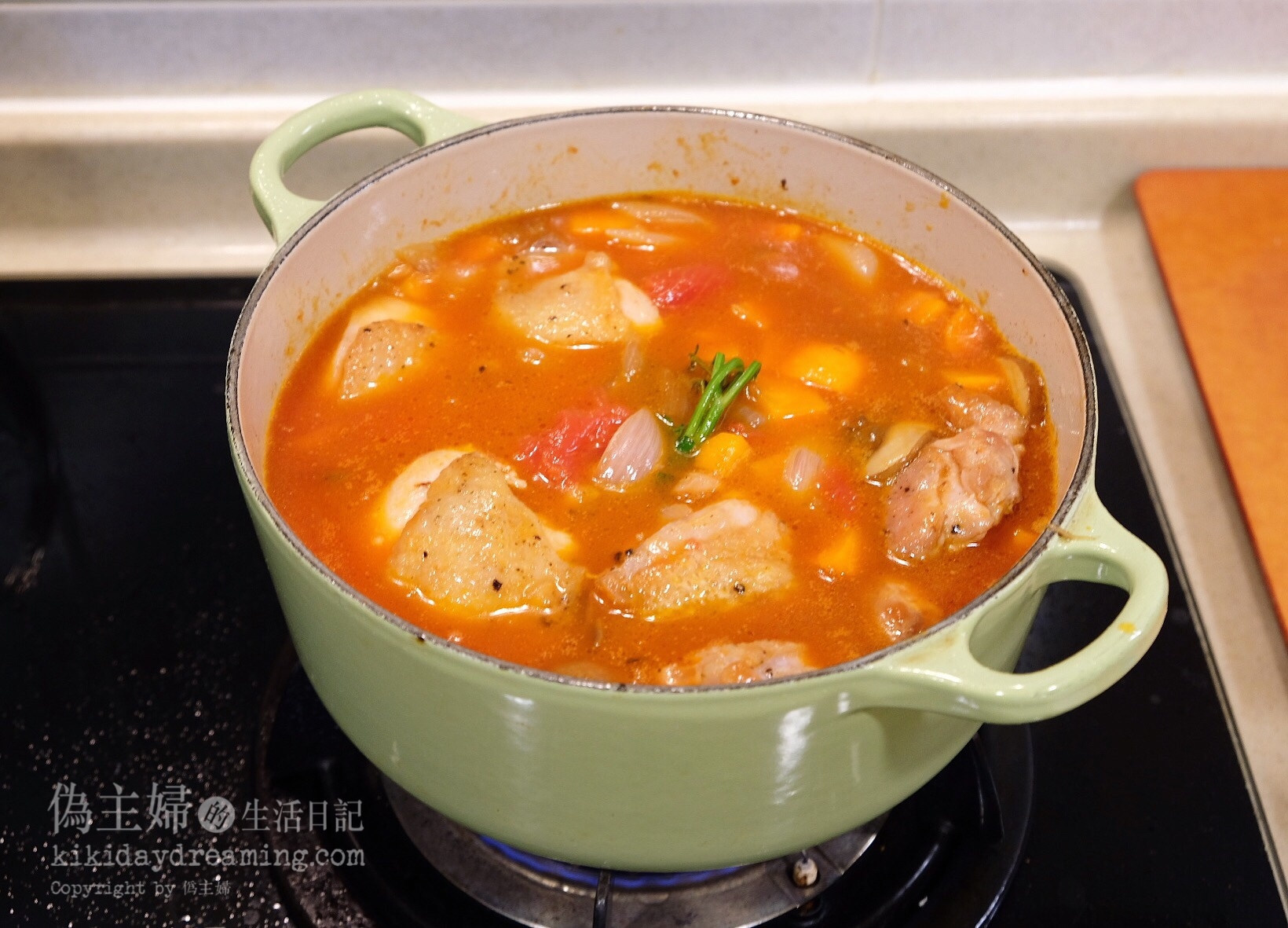 11. 到蔬菜全部炒香就可以把雞加進,再加入雞湯至剛剛蓋過材料,加蓋子慢火燉煮40分鐘