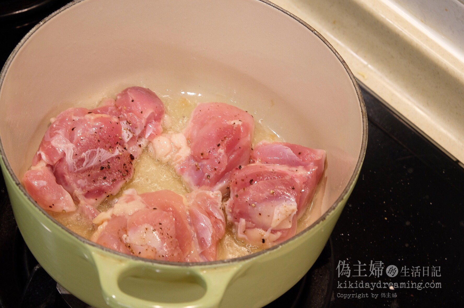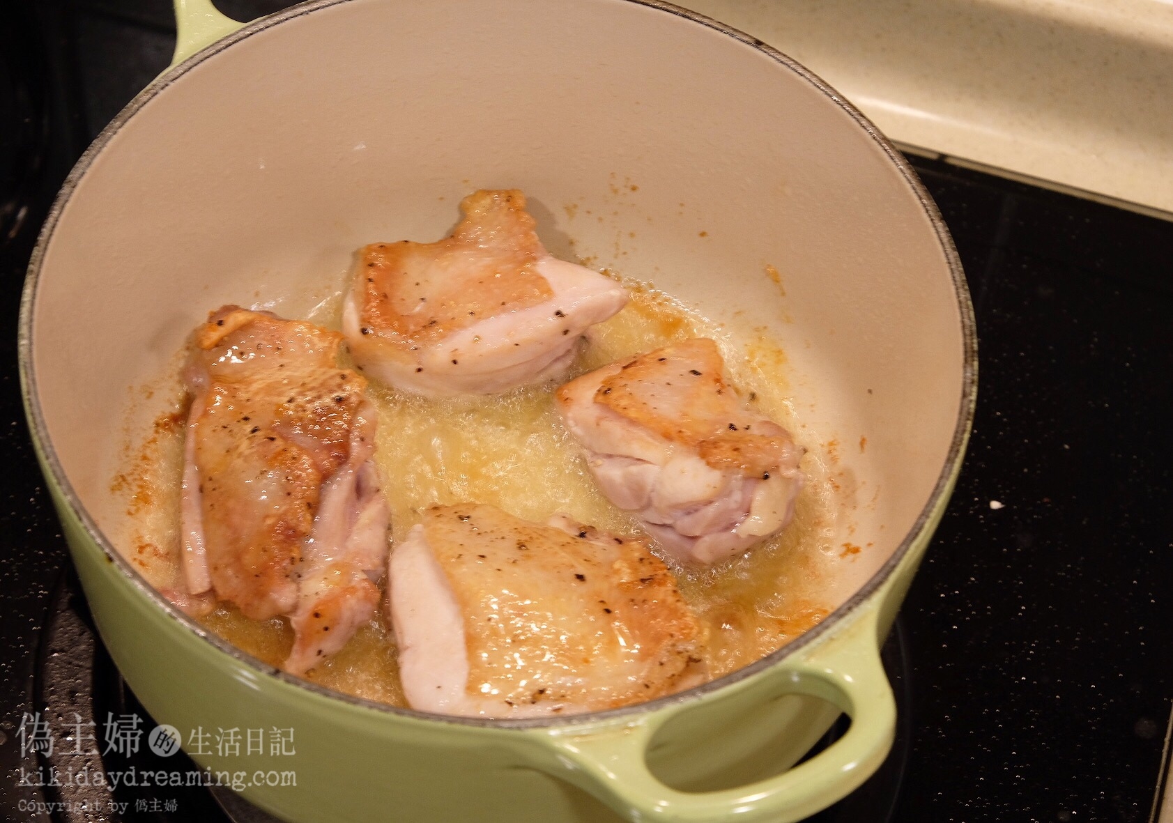 4. 鍋子下油燒熱,先煎香雞皮的一面,煎約兩分鐘左右火力不要太大