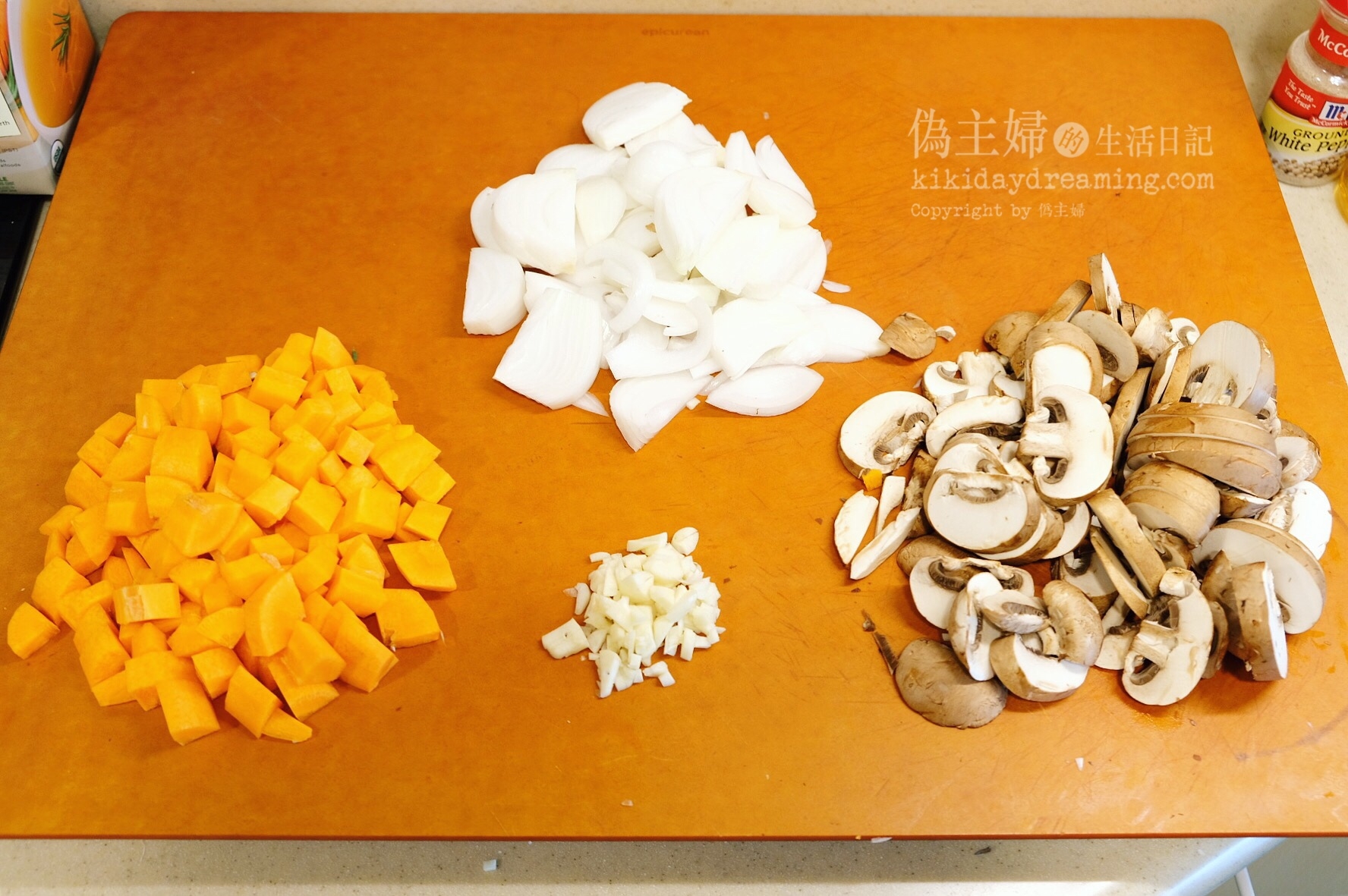 3. 然後來準備蔬菜,紅蘿蔔切小粒、啡蘑菇和洋蔥切成片、蒜切碎