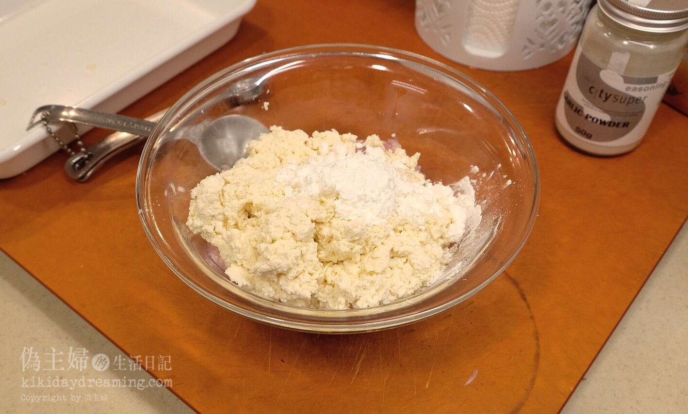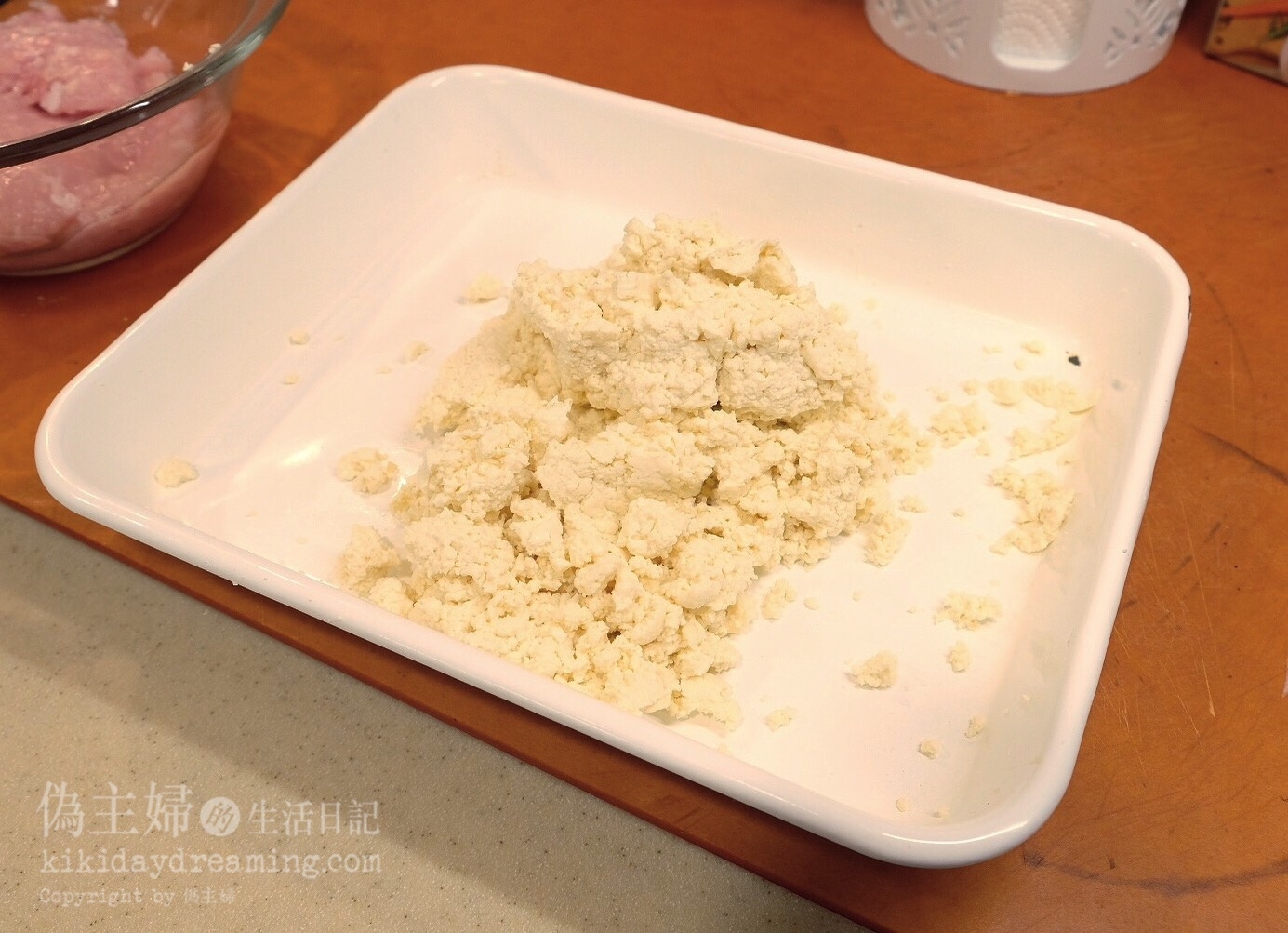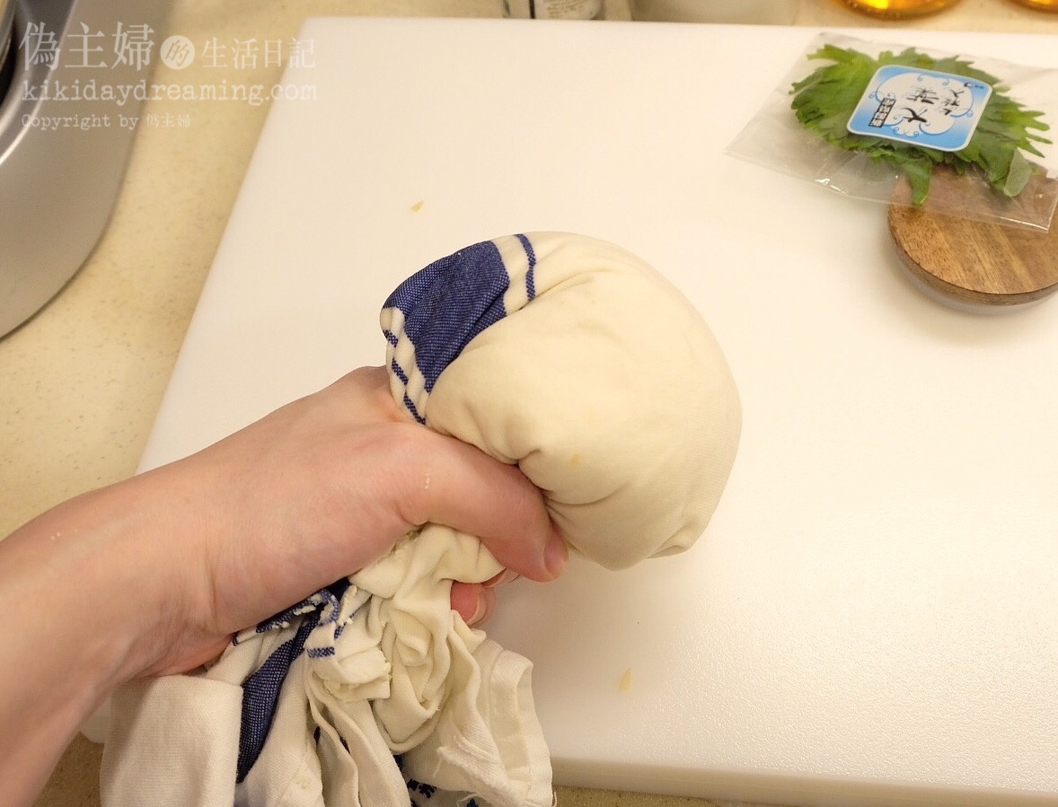1. 把木棉豆腐用乾淨的布包好,然後用力將水份擠乾