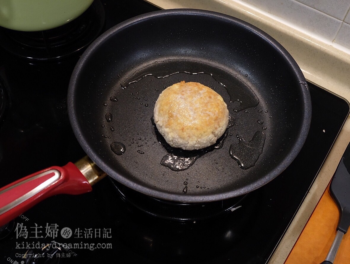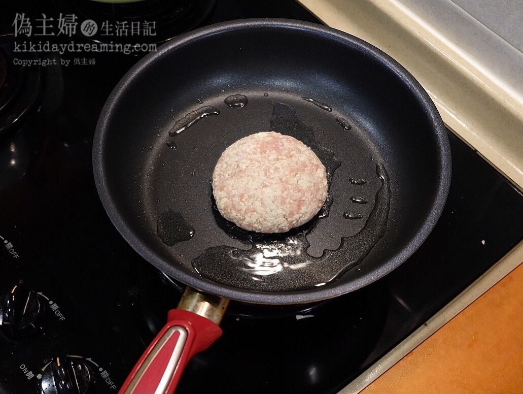 7. 平底鍋下油燒熱,以中火先將漢堡兩面煎封