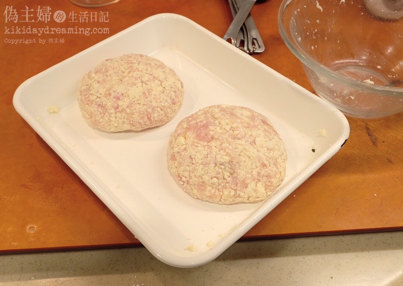 3. 分成兩份,再以左手拋右手、右手拋左手的方式將肉團甩拋十數下,將肉裡的空氣都拍出