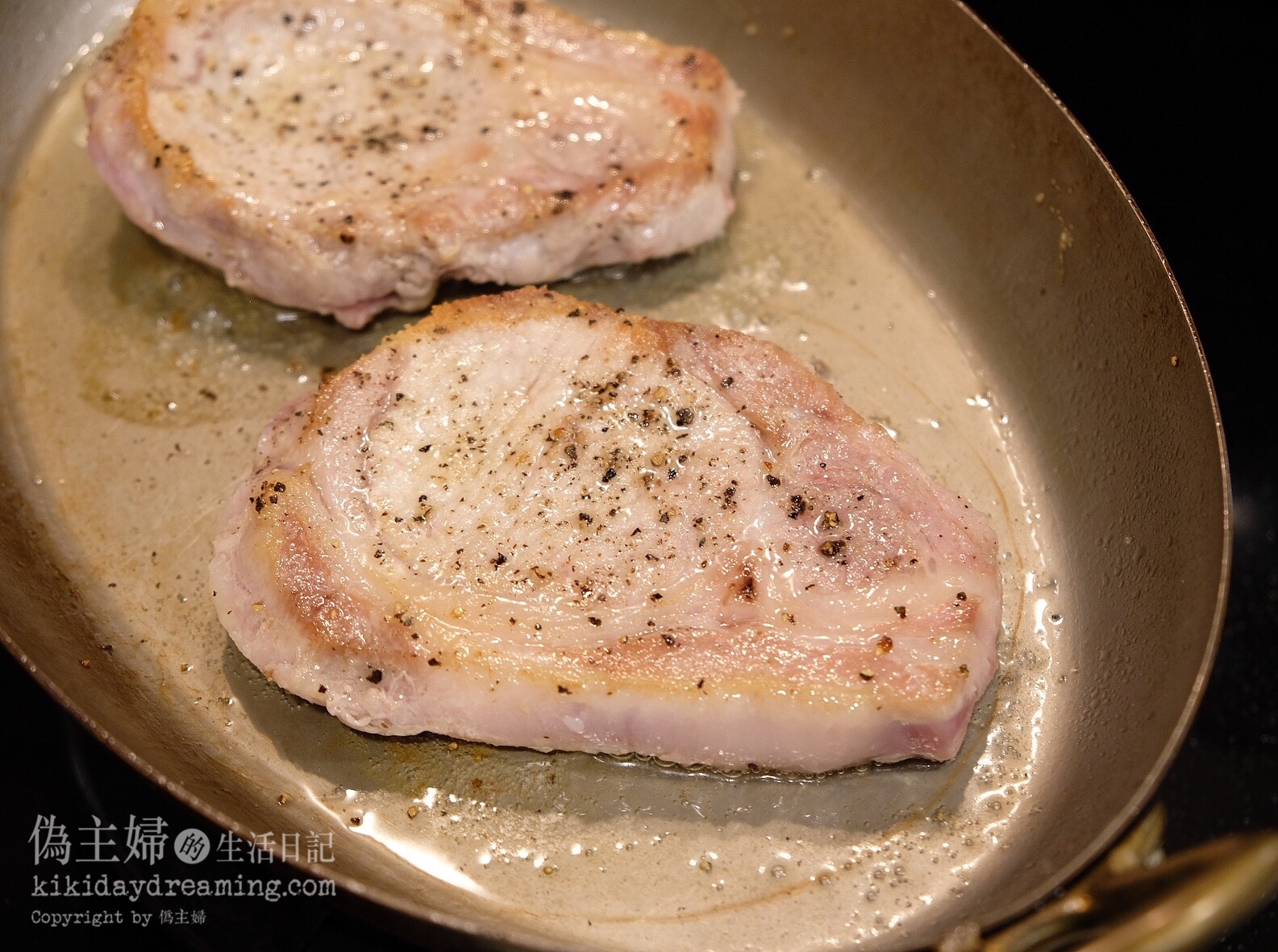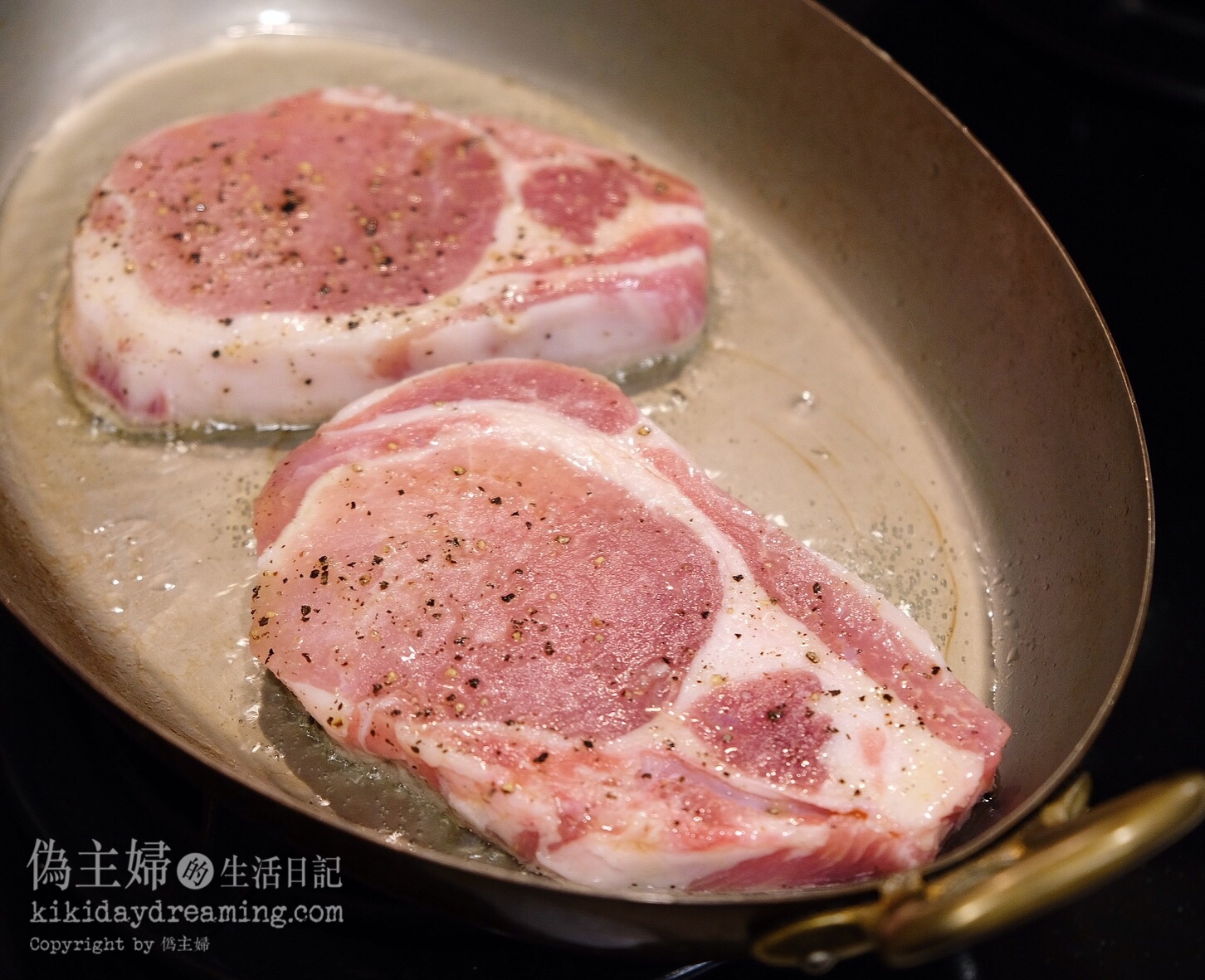 1. 先用橄欖油、鹽和胡椒把豬扒醃一下