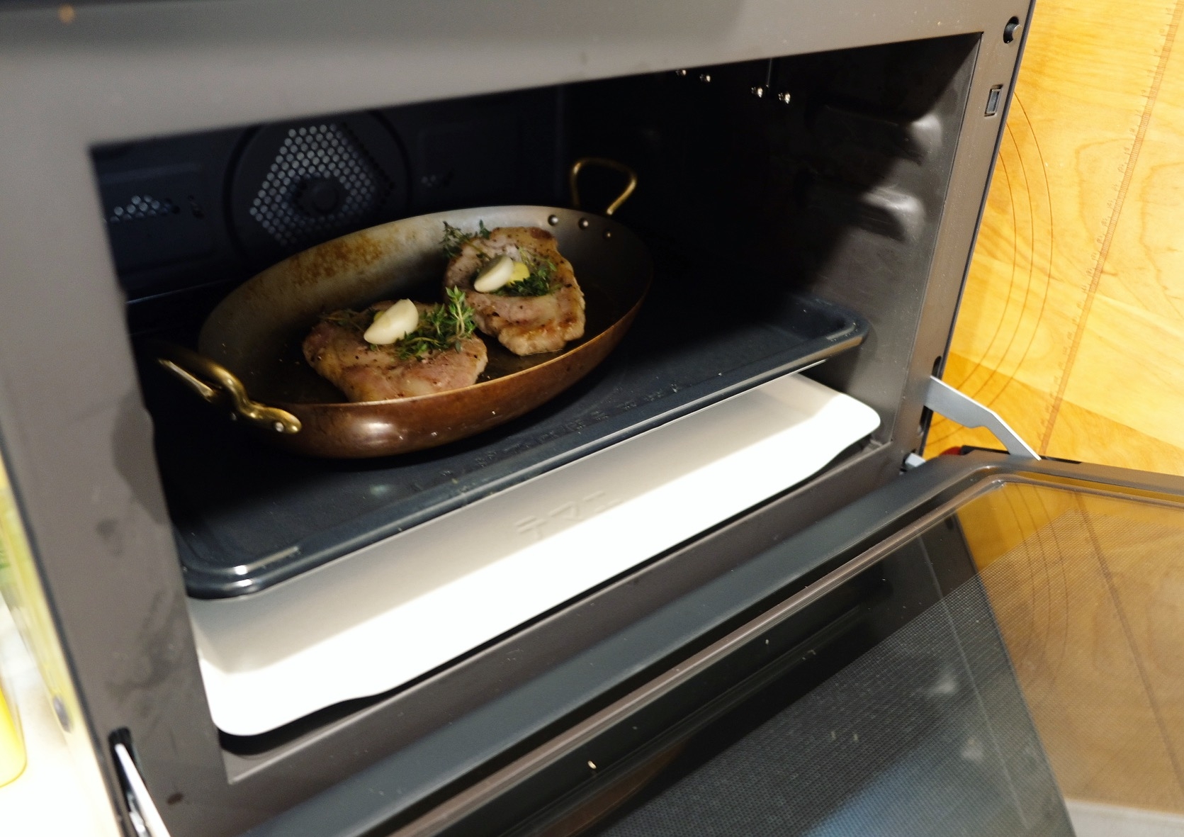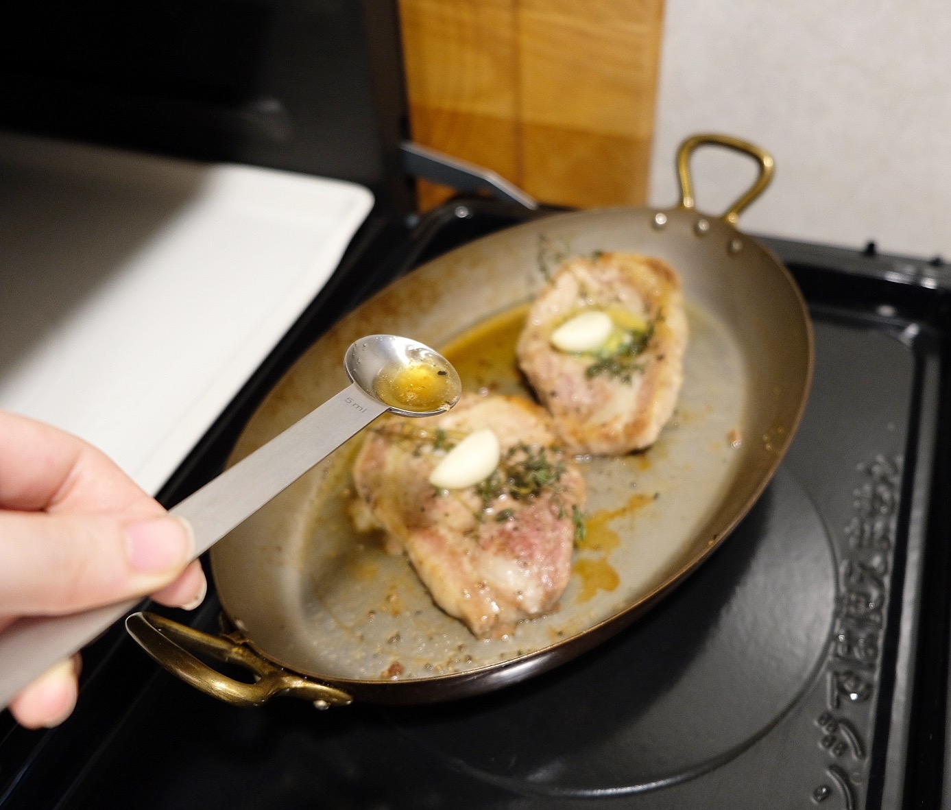 6. 期間要把肉汁和油淋上豬扒,令肉保持濕潤不會烤乾,大約十五分鐘一次