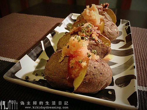 【深夜食堂煮婦同樂會第38話】來了!(有關同樂會的詳情在此)這星期的題目是奶油馬鈴薯,漫畫裡的做法是把牛油放到烤好的馬鈴薯上,然後鋪上鹽辣醃魷魚,聽起來好像很特別呢,這次終於有機會試試了 沒吃過鹽辣醃魷魚,不知道味道會如何,所以也買了明太子,順便試試哪一個組合比較好吃。材料就是以下這些了 (1)馬鈴薯洗淨,再在表面插一些小孔,方便烤的時候排氣 (2)把馬鈴薯扔到烤箱裡烤 (3)這次又是用烤箱的烤薯功能來作,如果普通烤箱就用... 看全文 -