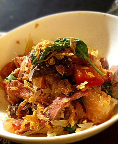 上篇提到的燒牛肉還沒有吃完,昨天晚餐就來一點點變化,做個好適合炎夏吃的泰式沙律。 材料: 主角又登場,對!又是它!我們已經連續吃了兩天三文治還沒有把它吃完,還剩下好大一塊。 至於其他材料就是柚子(或青木瓜)和蕃茄,調味則是青檸汁、魚露、乾蔥乾蒜酥、烘香的碎花生和泰式羅勒和水,每種都加一咪咪,試到自己喜歡的味道就可以。乾蔥和乾蒜酥我沒有自己炸,貪方便買了現成的。 做法: (1)先將燒牛肉切條,由於是冷吃,將脂... 看全文 -