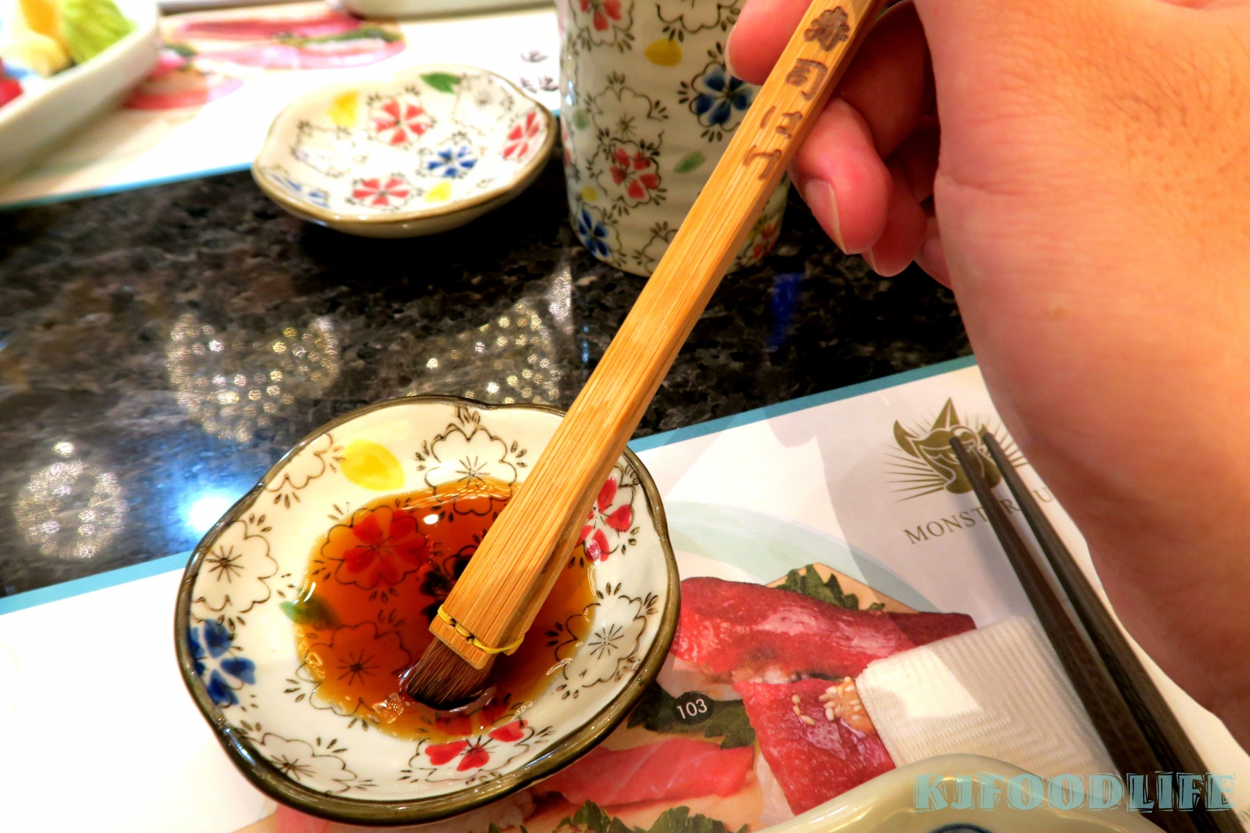 望一望枱面有枝掃既,當然唔係俾你寫字喇,而家用自家醬油掃上壽司面,代替左平時既豉油以免變左壽司飯既味。