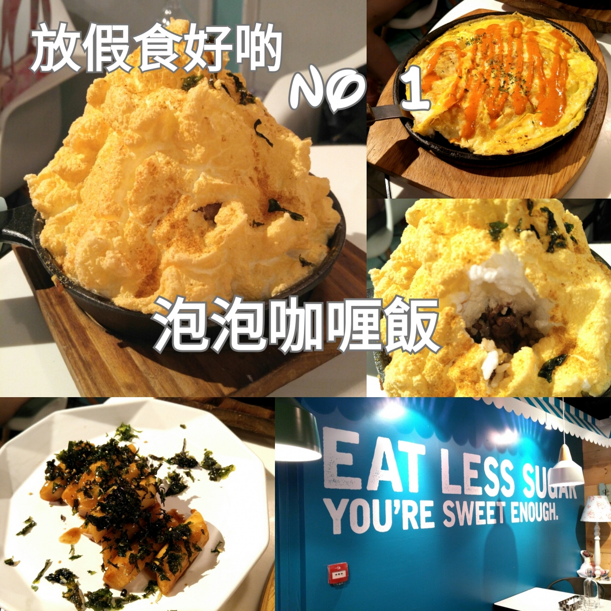 正所謂請一日放四日 放假緊係想食好啲 餐廳藍色主色簡直超靚 誰不知中招喇 既然外面易拉架同餐牌封面都係佢 即係招牌菜就一於試下 咖喱牛肉抱泡鍋飯($118) 個樣好吸引好似雪山包住咁 其實係牛肉飯上面打左一層蛋白 面頭蛋白無味都預左 飯都無咖喱味連牛肉都可以煮到淡味既 名乎其實既有色無味 海鮮泡菜蛋餅($68) 係正正常常咁將泡菜煎餅變奏 多左蛋味同... 看全文 -