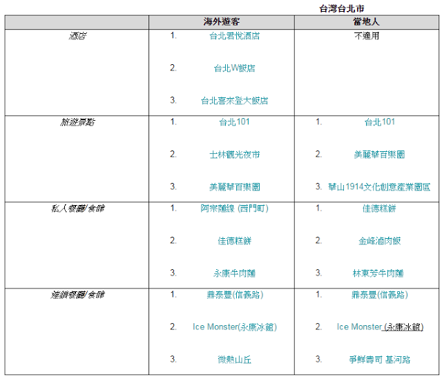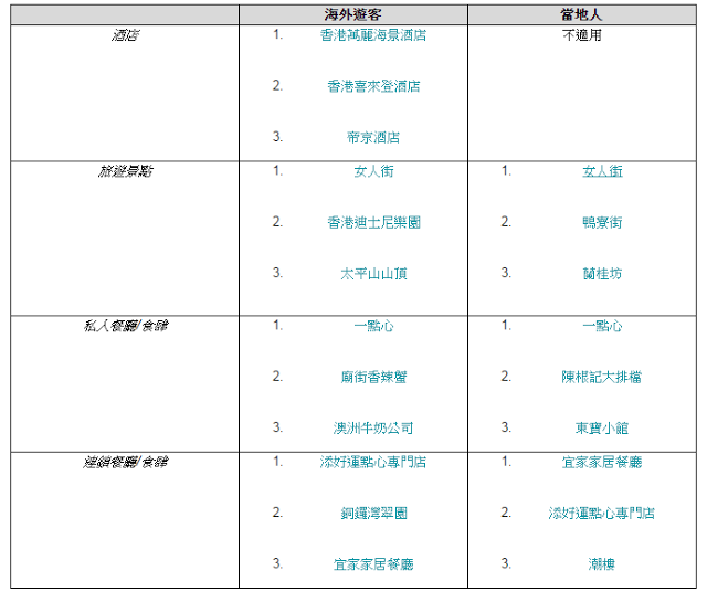 - 海外遊客和香港人最常到的香港連鎖餐廳是添好運點心專門店和宜家家居餐廳,而台北的首兩位分別是鼎泰豐和Ice Monster (永康冰館)