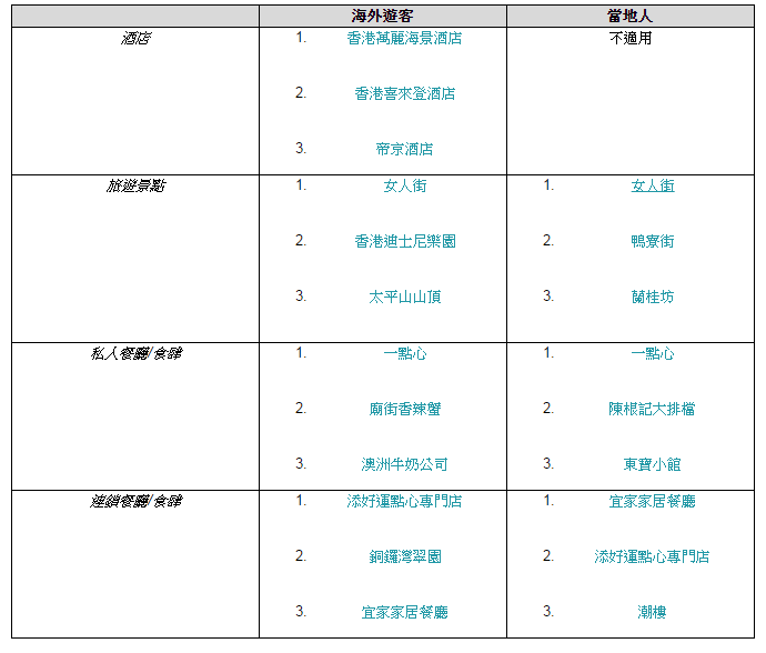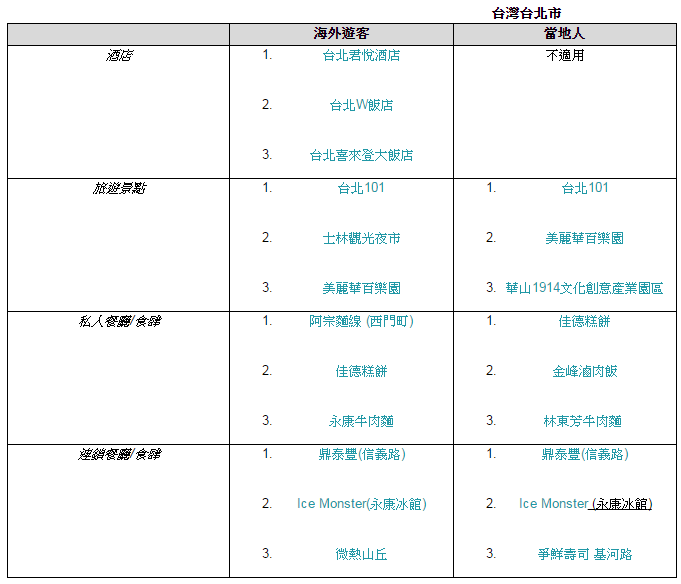 - 海外遊客和香港人最常到的香港連鎖餐廳是添好運點心專門店和宜家家居餐廳,而台北的首兩位分別是鼎泰豐和Ice Monster (永康冰館)
