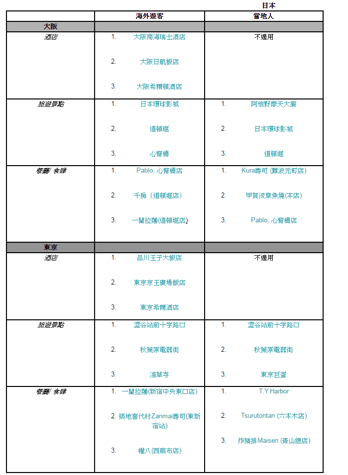 - 參考幾個亞洲城市的數據,許多海外遊客和當地人都會選擇到同一餐廳或食肆