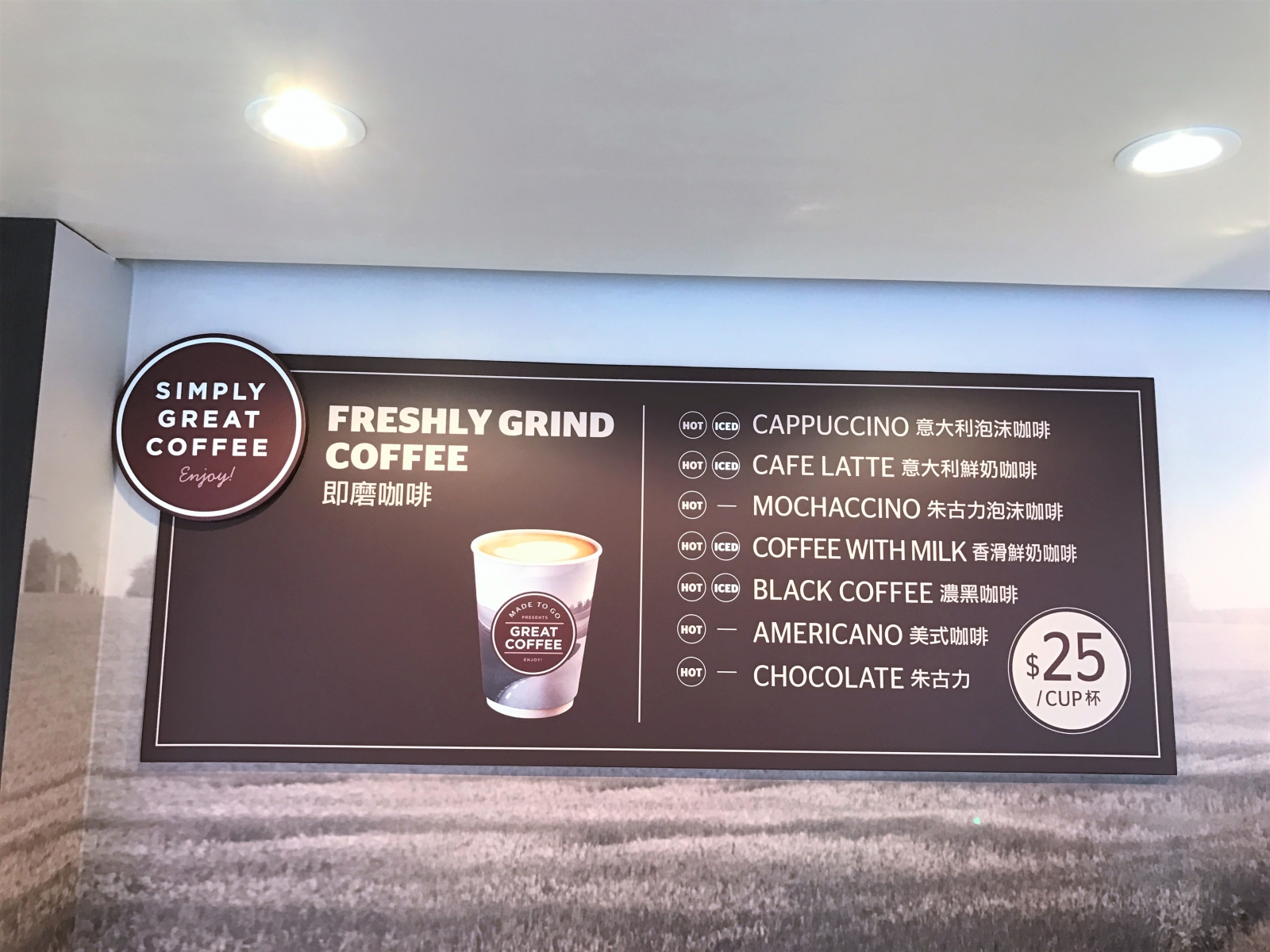 有幾款咖啡選擇,冷熱同價,每杯$25。