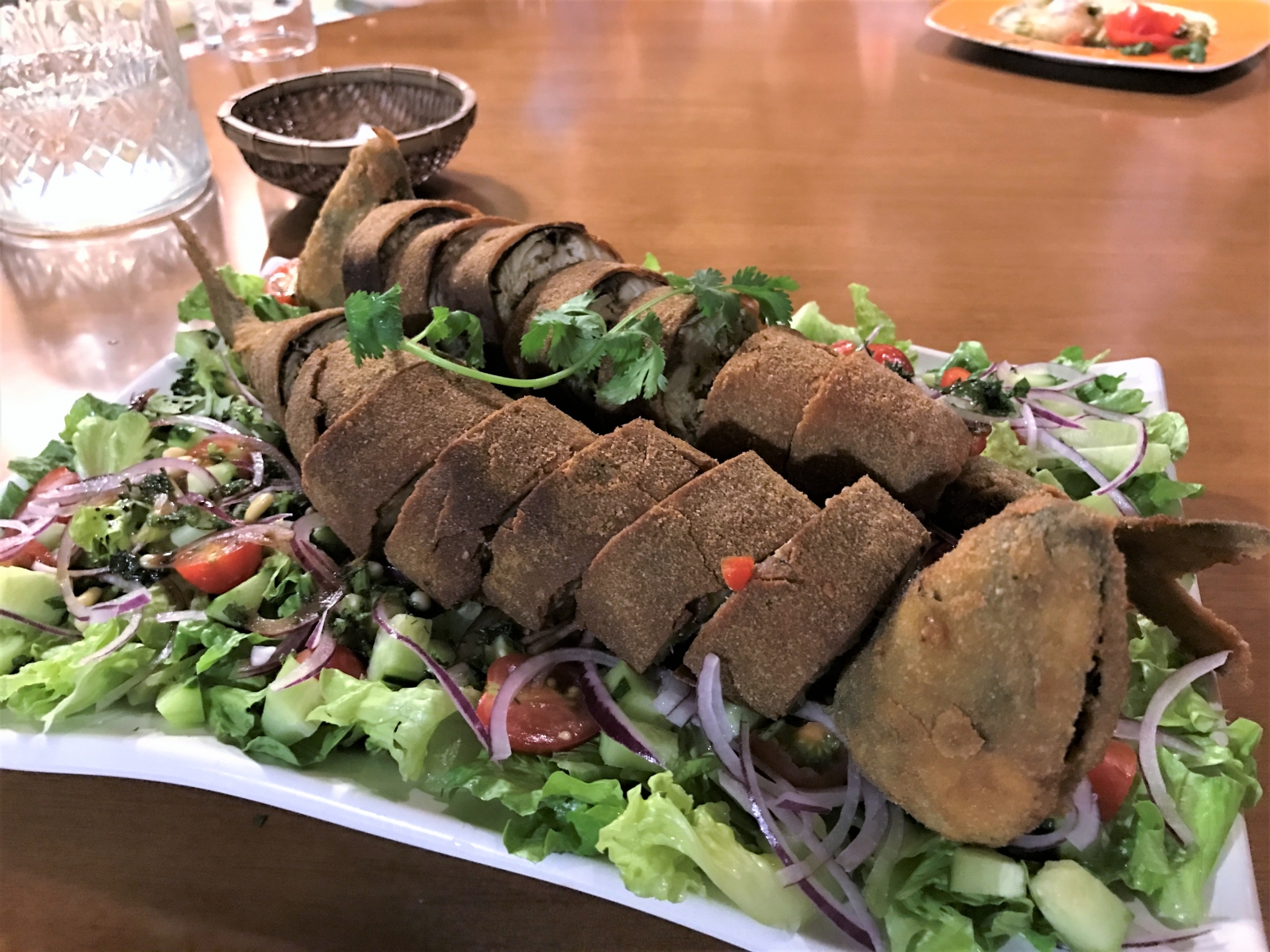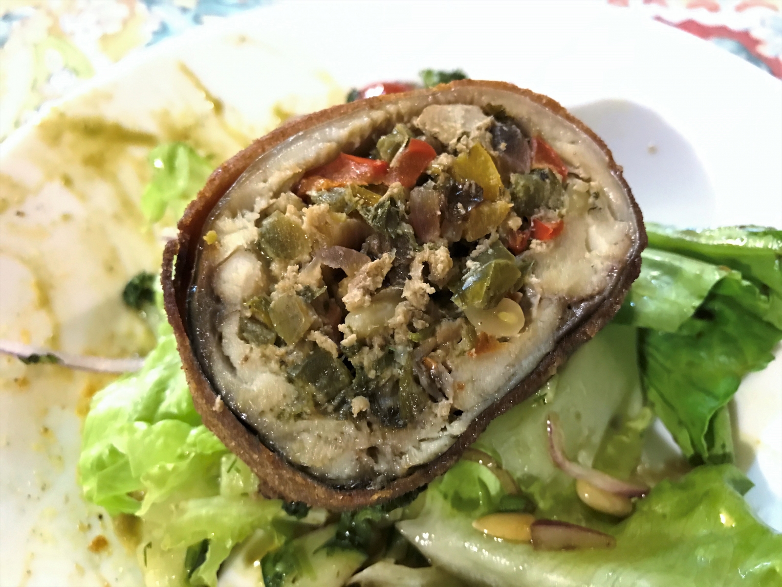外層炸得香脆,魚肉扎實,味濃不腥。餡料有鯖魚肉、松子和三色椒等,非常好吃!